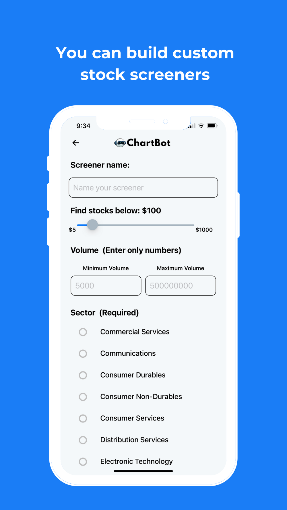 Automate your trading research with ChartBot. Get real-time trading alerts and build custom stock screeners. Stock screeners are updated daily with stocks that match your specific criteria. ChartBot scans the stock market daily and sends you alerts with actionable information to help you make more informed decisions.