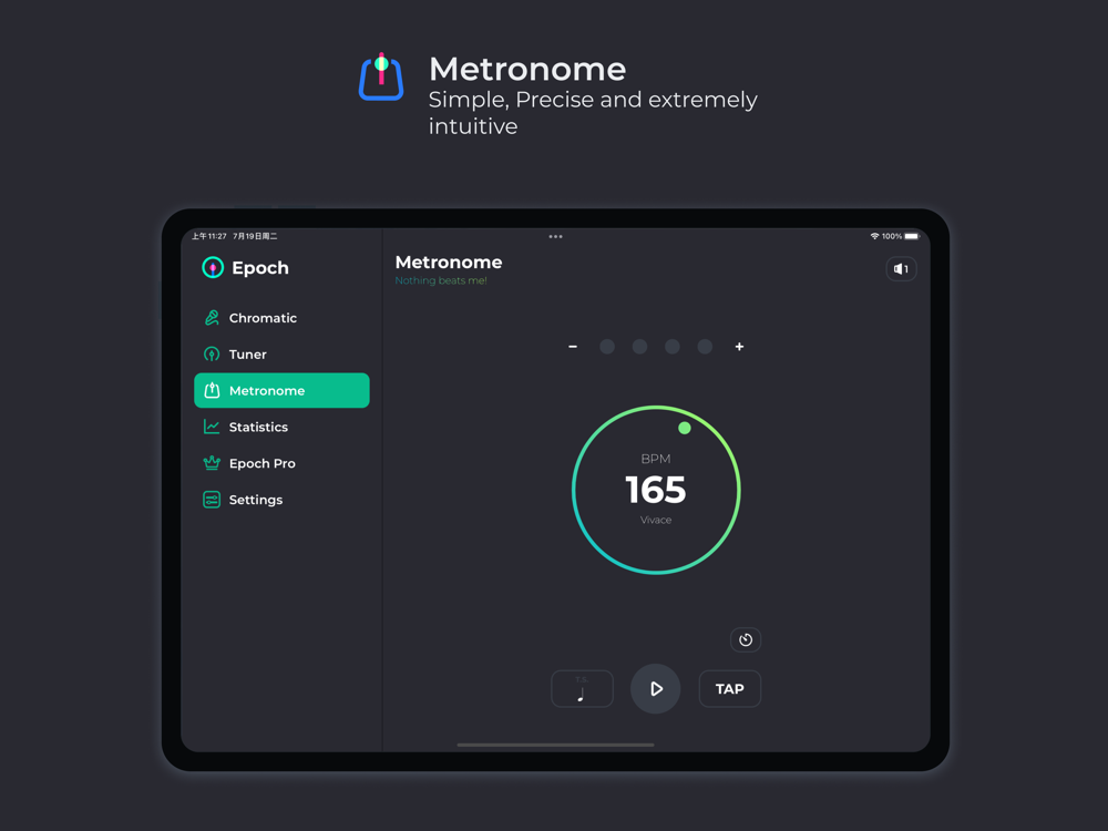 Epoch is a guitar, ukulele, and bass tuner with a built-in metronome, pitch detection, and practice tracking capabilities.