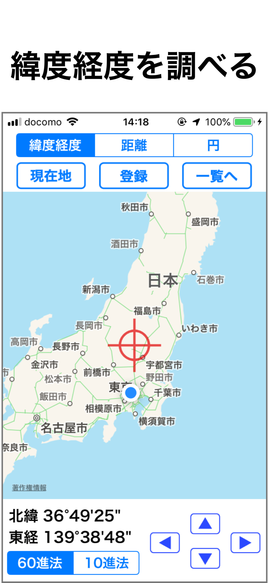 地図上の中央の地点の緯度経度を調べたり、指定した緯度経度の地点を地図の中央に表示したりします。