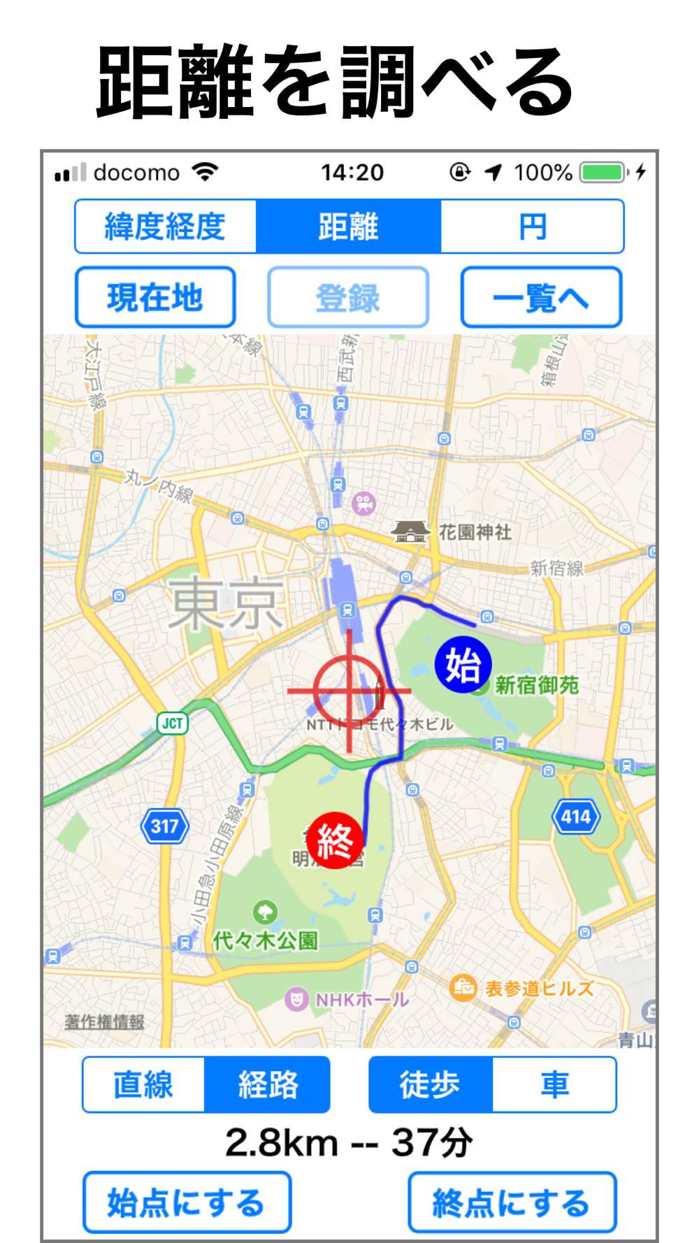 経路の場合は徒歩か車か選べ、所要時間を表示しますが、電車やバスなど公共交通機関を使った経路を調べることはできません。