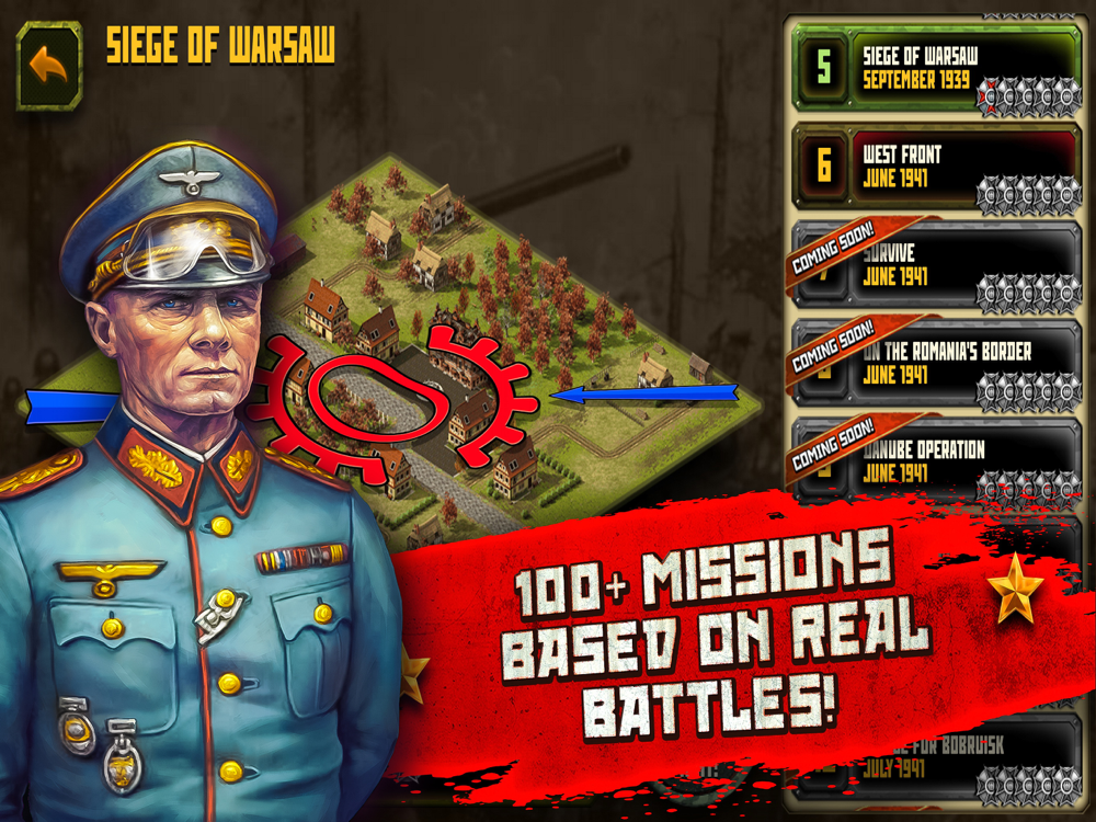 You will lead famous Rommel corps and fight in battles for Tobruk (1942) and El Alamein. Or imagine yourself in the role of Manstein or Guderian and take part in the Battle of Moscow, as well as the largest tank battle in history of mankind - The Battle of Kursk (1943). Epic city battles in Battle of Berlin (1945) await you in the end.
