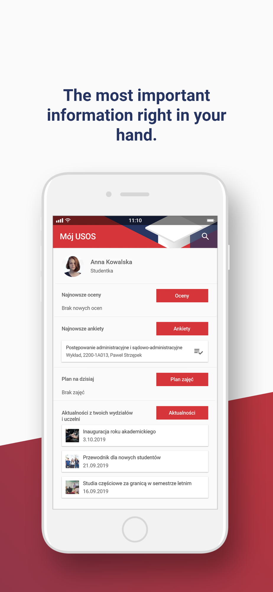 Application provides the most handy features of the University Study Oriented System (USOS): timetable, course groups, grades, surveys, USOSmail, student ID, eID, news, academic calendar, guide, map and catalog.