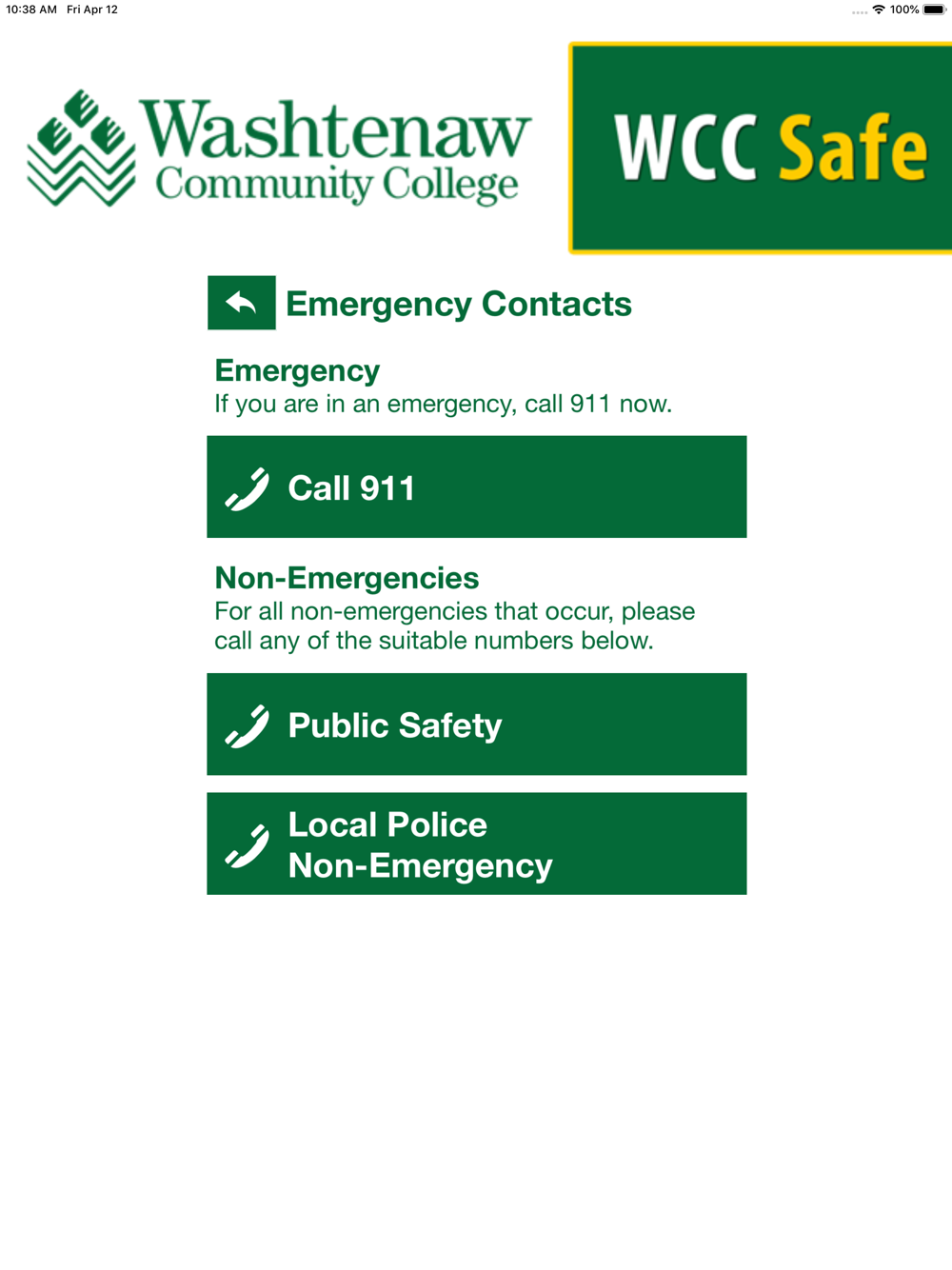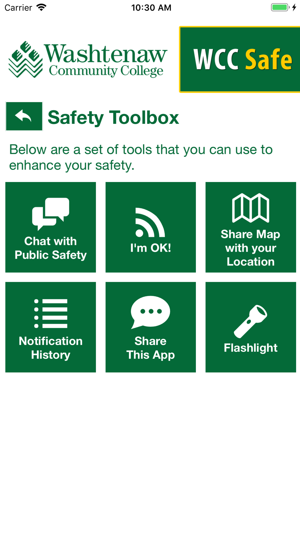 WCC Safe is the official safety app of Washtenaw Community College. It is the only app that integrates with Washtenaw Community College's safety and security systems. Public Safety has worked to develop a unique app that provides students, faculty and staff with added safety on the Washtenaw Community College campus. The app will send you important safety alerts and provide instant access to campus safety resources.