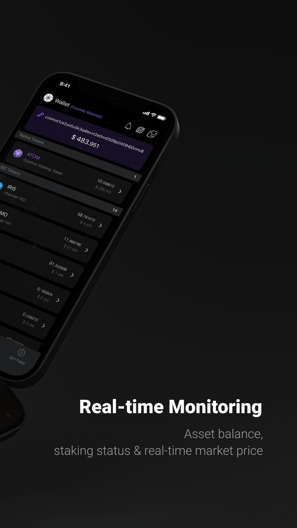 - Manage ATOM, IRIS, IRIS Tokens and check real-time price change.