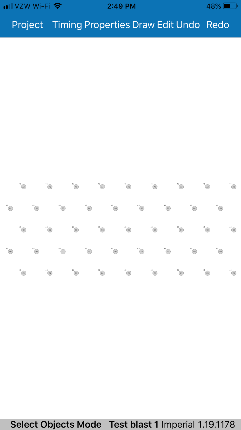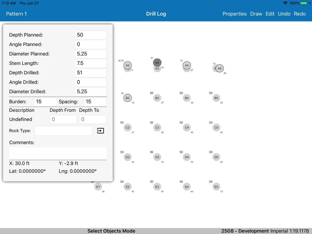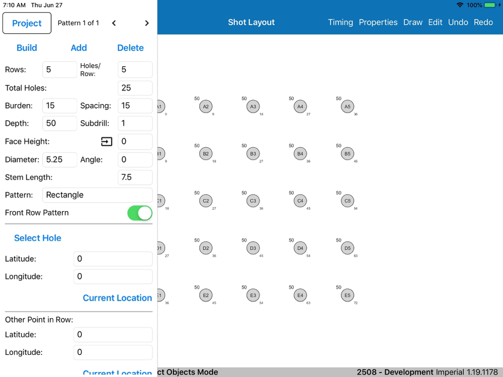 DynoMobile allows the blaster to design shots on a mobile device using absolute burden and spacing values or GPS coordinates. Complex patterns can be designed with the ability to add notations and drawing to the pattern. A created design can be shared with the blaster or driller electronically to track properties for each hole. This information can be uploaded to the Electronic Shot Report (ESR) to create the pattern and integrated with the EC200 to provide design, drilling and loading data for each hole.
