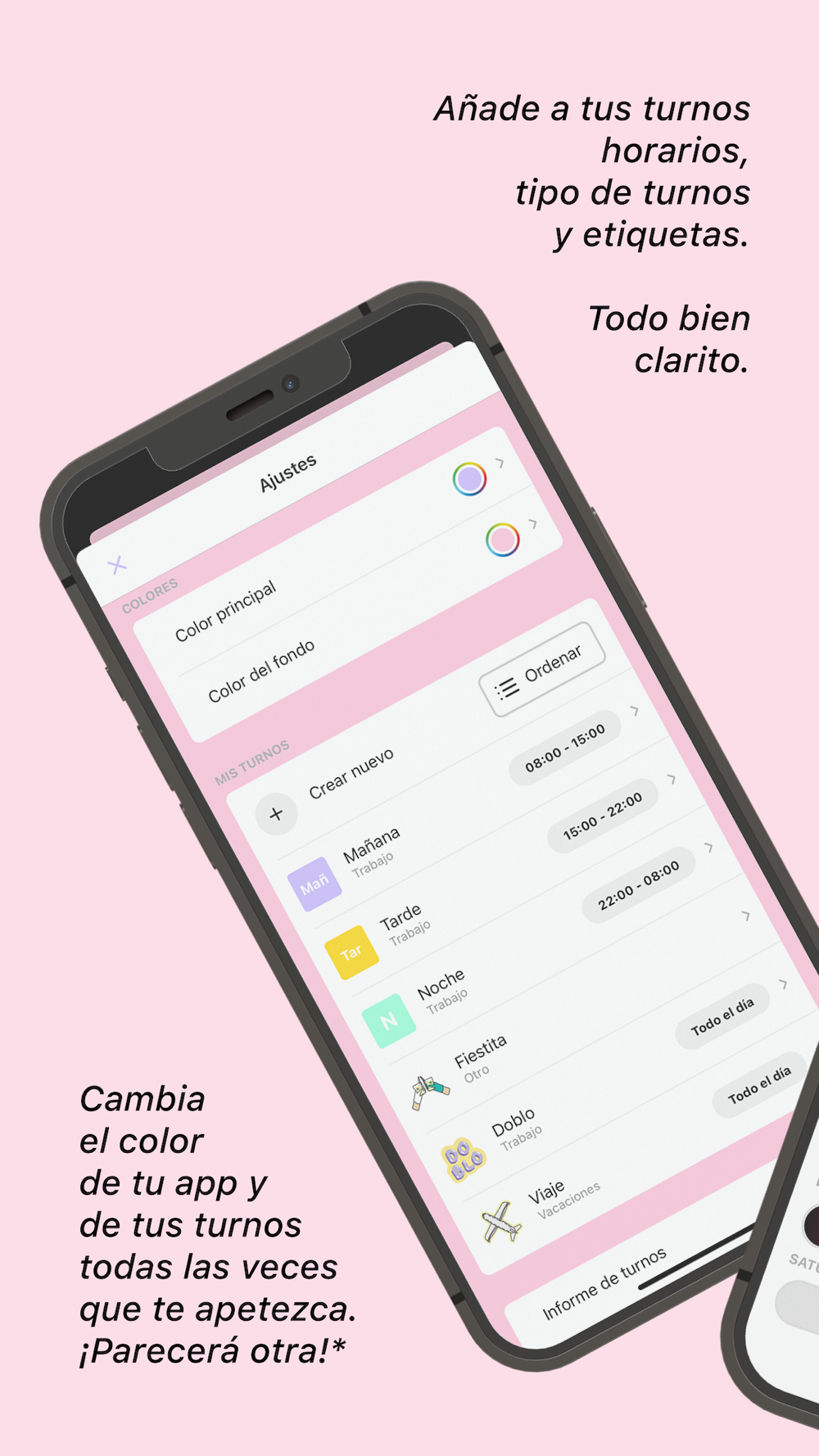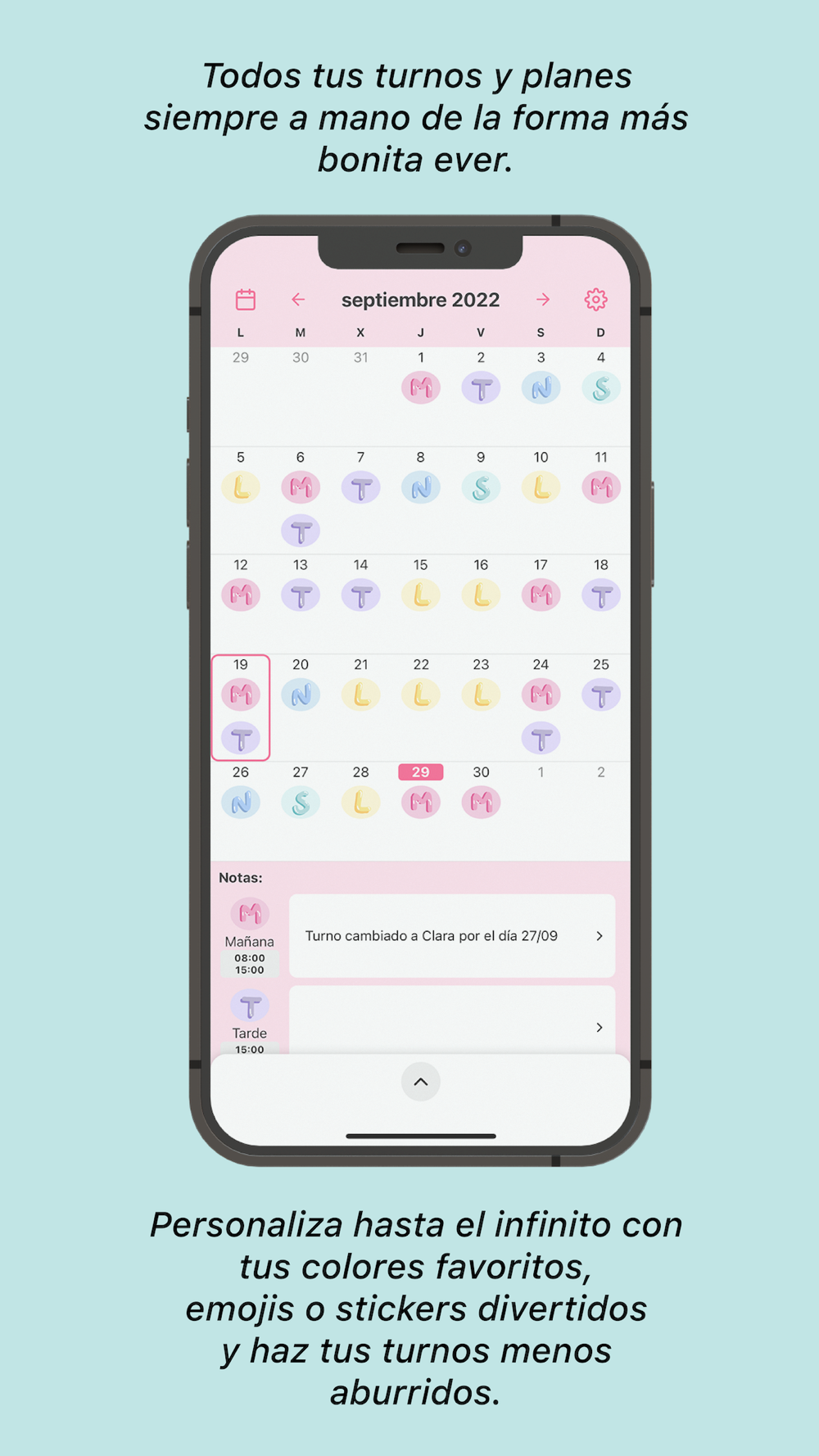 • PERSONALIZACIÓN TOTAL: Modifica tus turnos con diferentes colores, formas y stickers. Cambia los colores de la app para hacerla tuya.