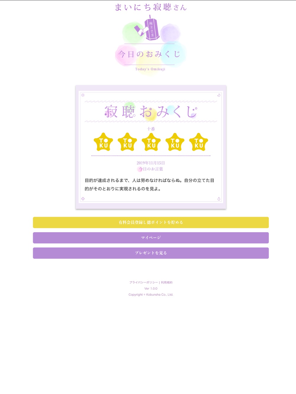 今日はどんな日? 選んだおみくじで、優しく時にきびしい寂聴さんの名言が読めます。表示された星の数で、「徳POINT」を積むことができます。
