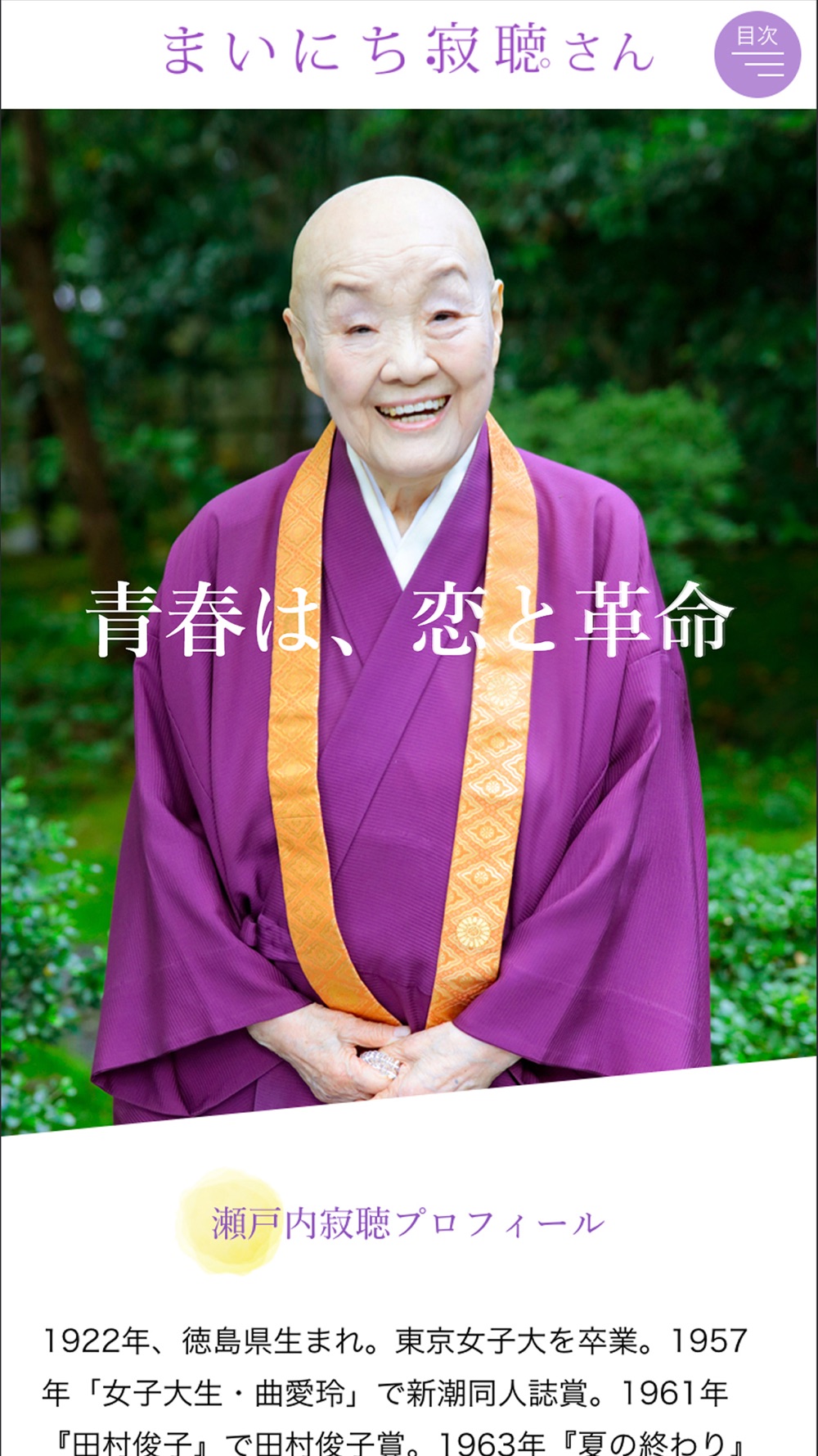 トップ画面の寂聴さんの写真に触れると生VOICEでご挨拶。
