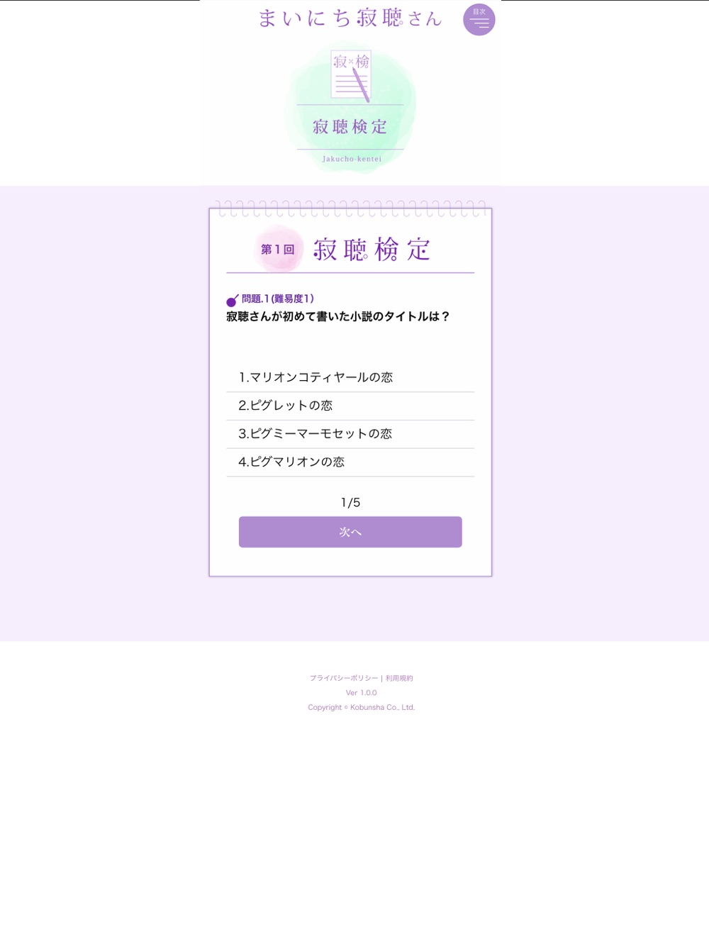 寂聴さんについての検定クイズを出題。あなたの寂聴さん愛とオタク度が試される楽しい検定です。正解すると「徳POINT」が積めます。ボーナス問題に正解すると、「ボーナス徳POINT」も!