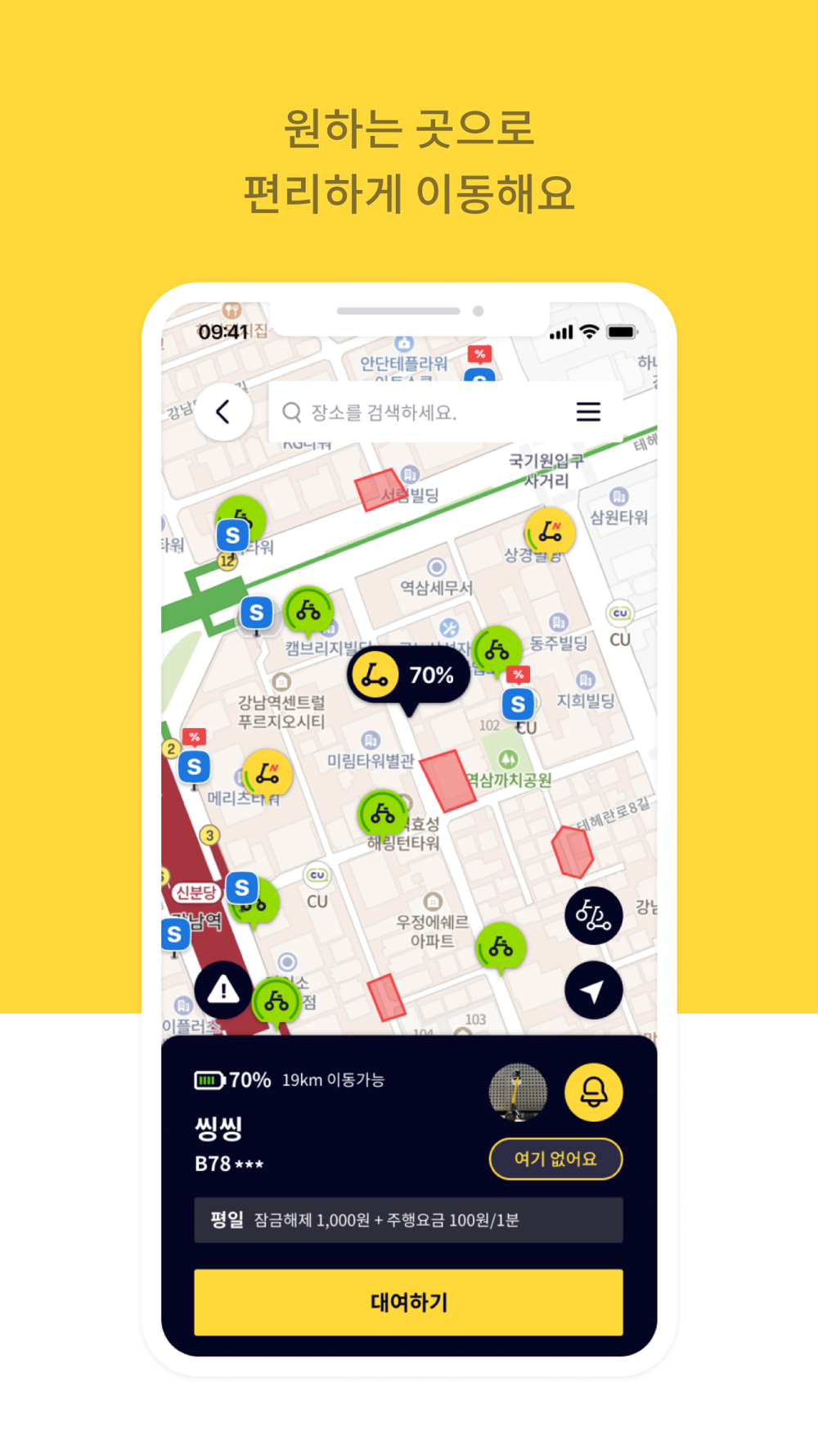 1. 앱을 실행하여 주변의 가까운 씽씽 전동킥보드를 찾습니다.