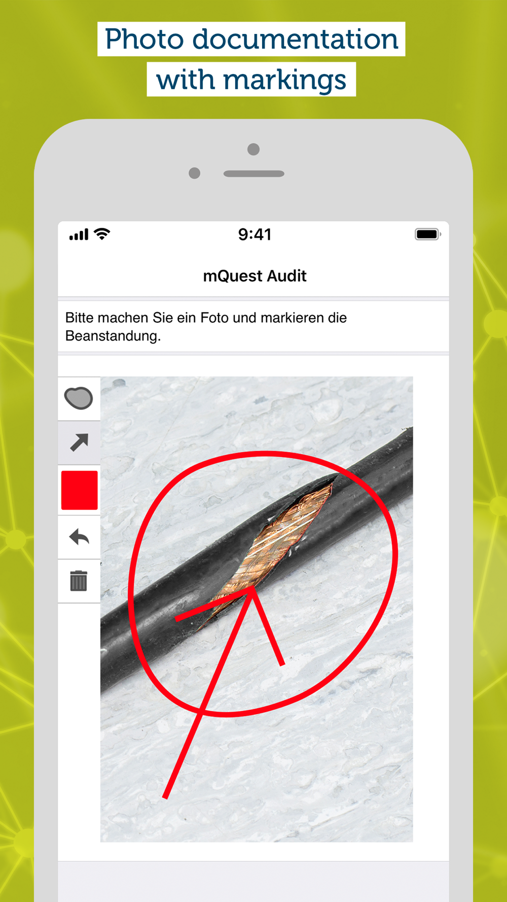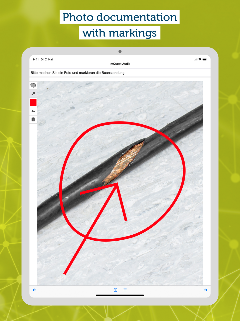 The mQuest digitization platform is a clever combination of a web-based portal and an offline-capable app. In addition to all common input options, such as text or number fields, the system also supports photographs with marking functions, signature fields and extensive multimedia functions. Collected data is immediately available and can be evaluated and processed centrally.
