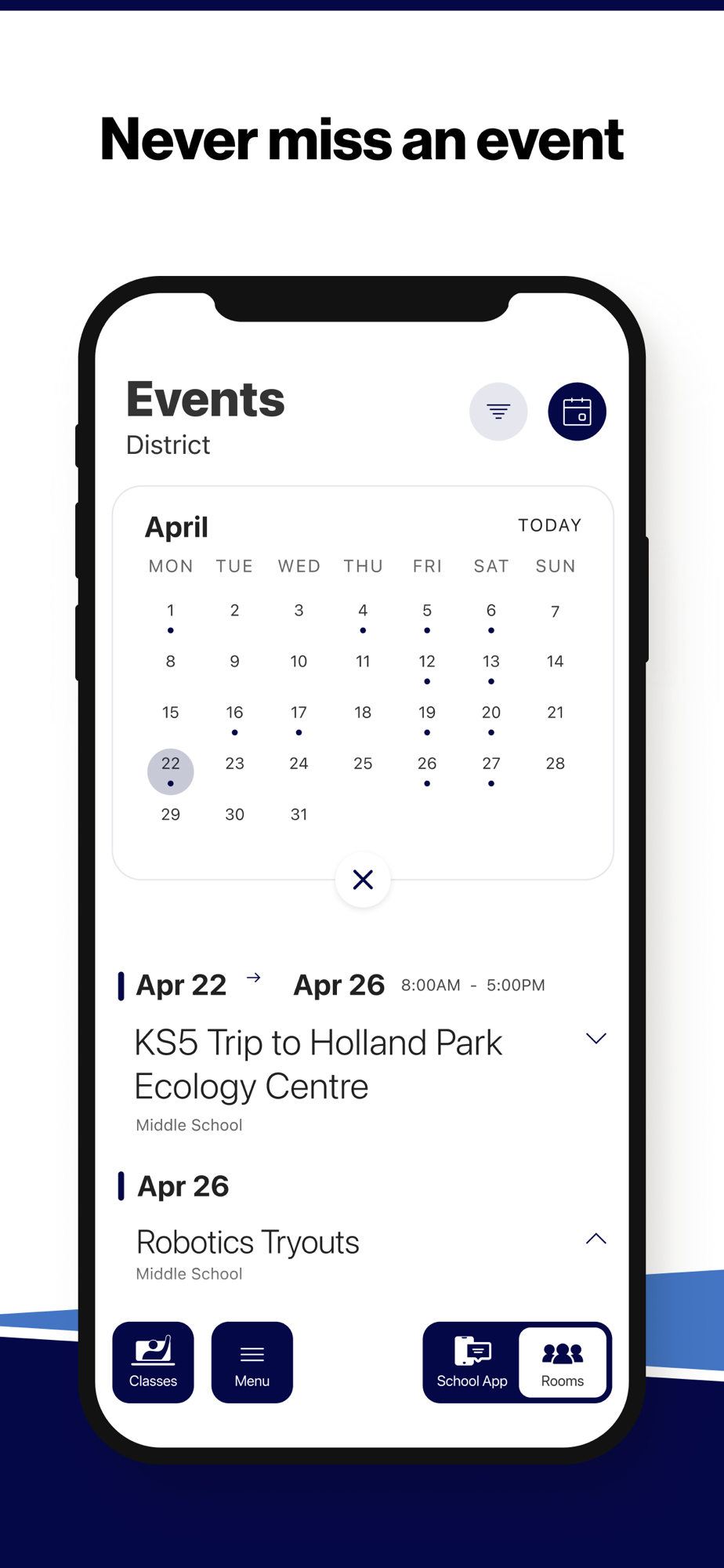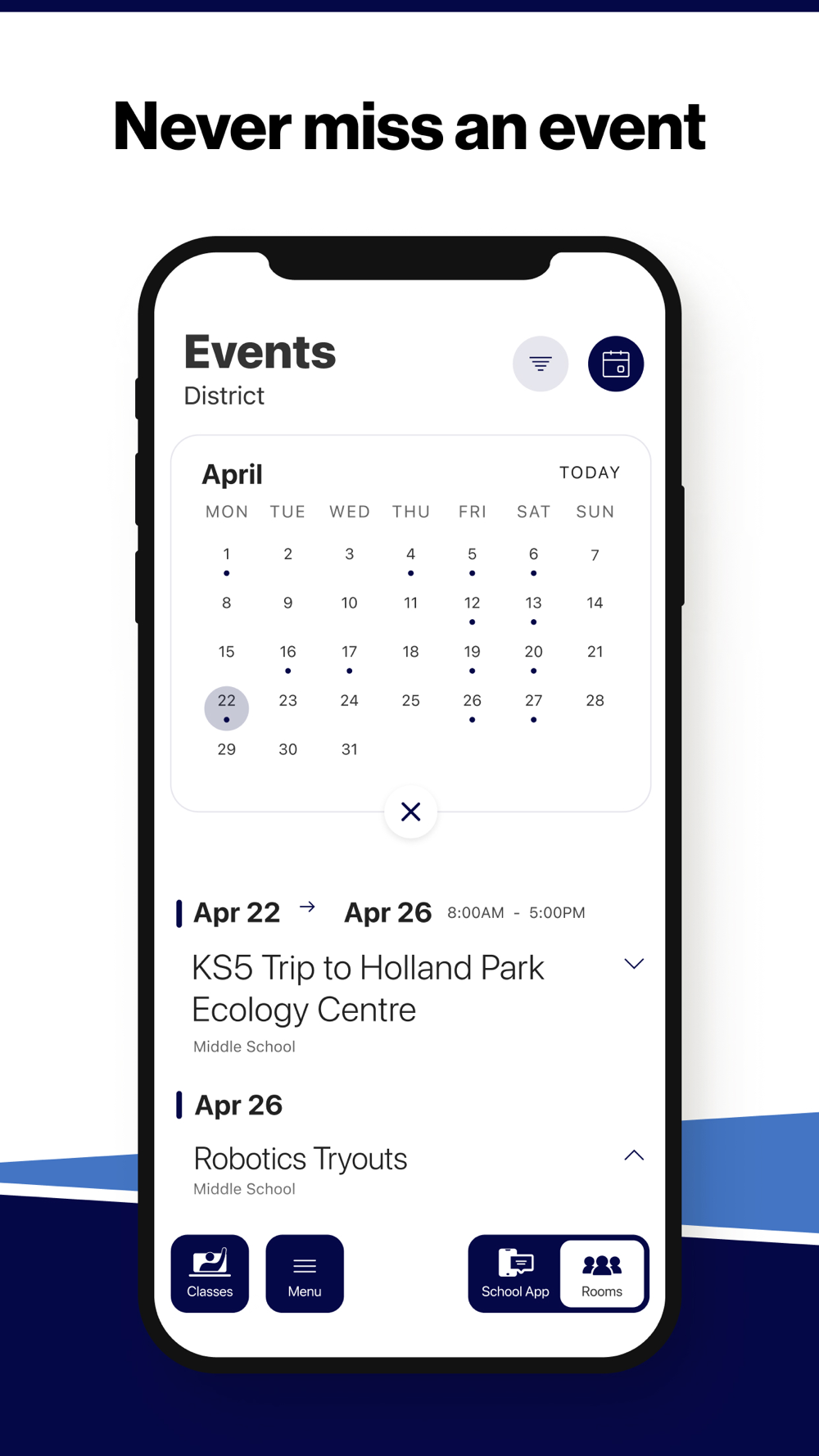 The event section shows a list of events throughout the district. Users can add an event to your calendar to share the event with friends and family with one tap.