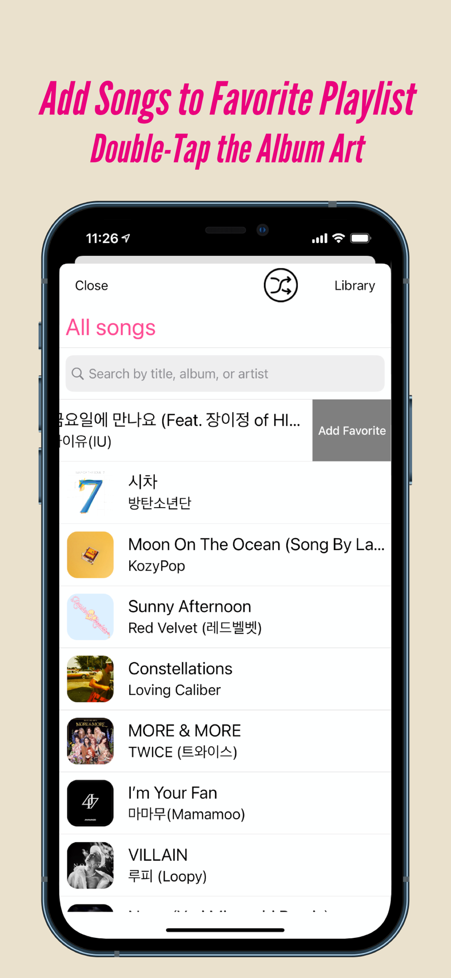 - Add songs to Favorite playlist for quick access by swiping left from the play list or double tapping the album art