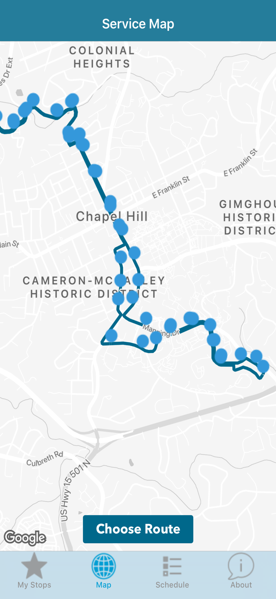 Chapel Hill Bussing is the updated solution to find your way through the bus system in Chapel Hill. CHB uses NextBus API to give you estimated arrival times of buses at individual bus stops.