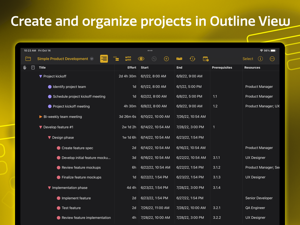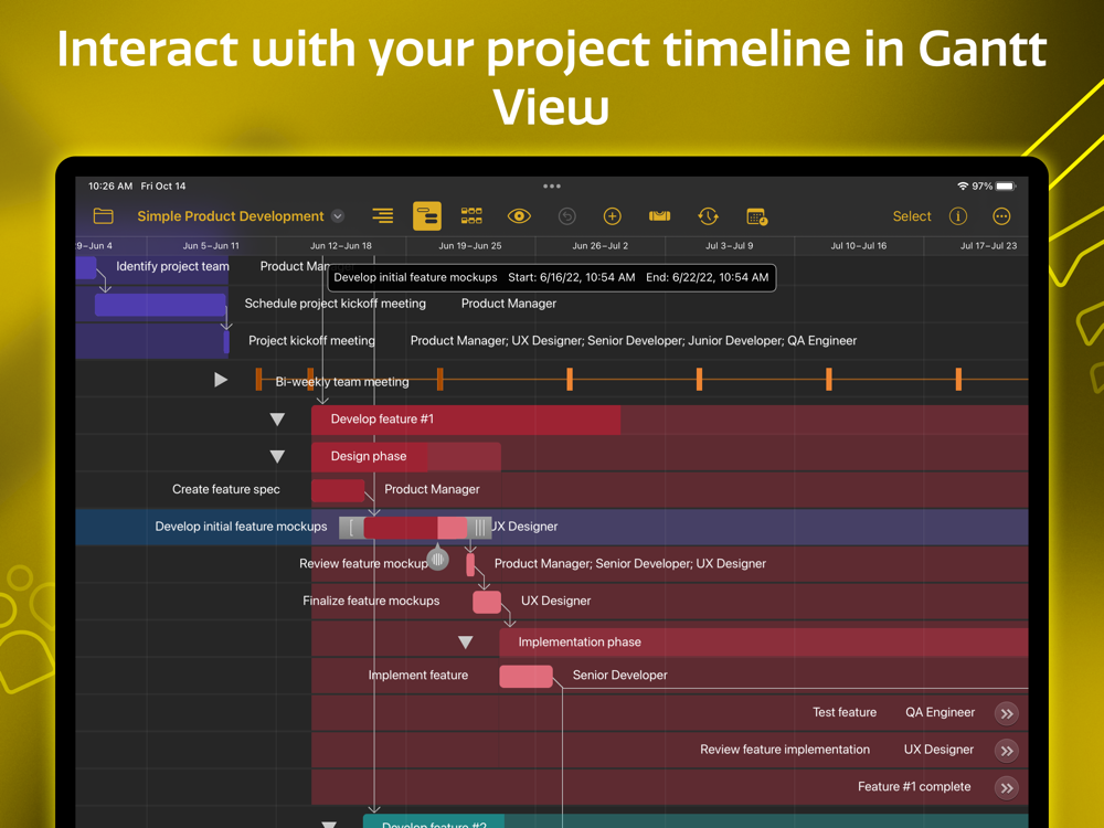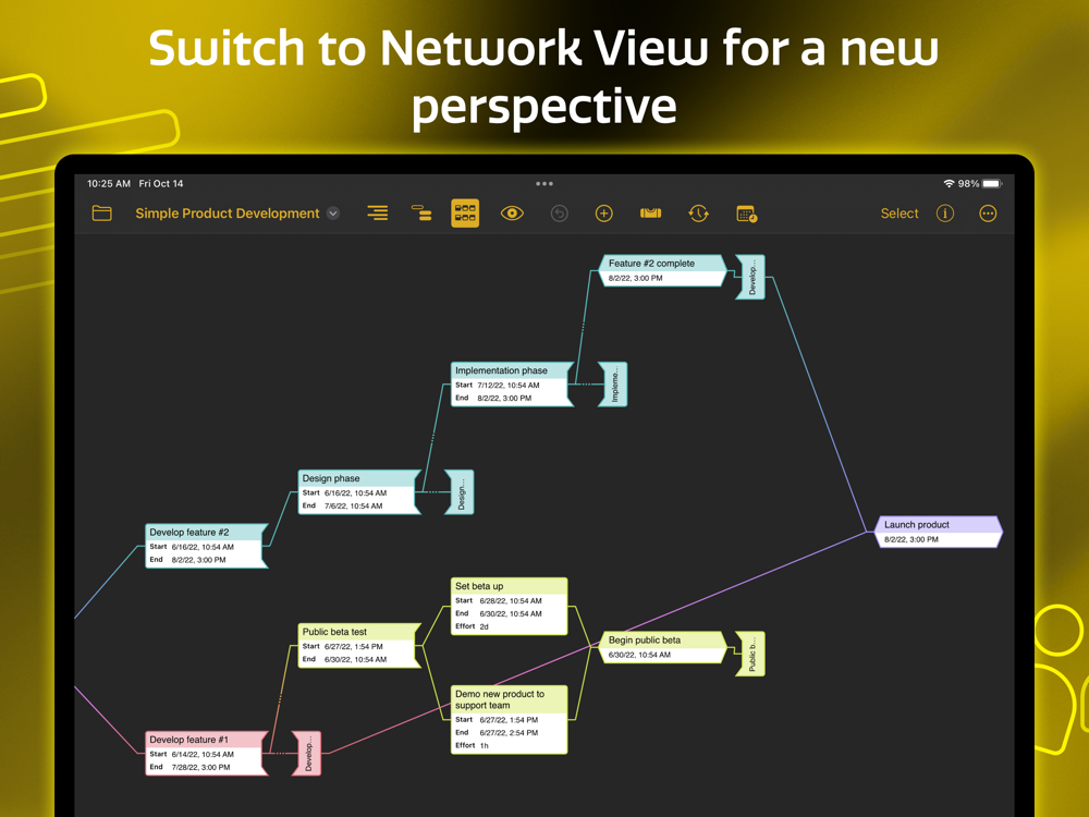 OmniPlan gives you the power to manage complexity by helping you view, edit, and organize projects. Effortlessly track your progress, manage your team, and continuously improve your processes with features including Gantt charts, network diagrams, resource leveling, collaboration, multi-project dashboards, milestones, and critical path highlighting.