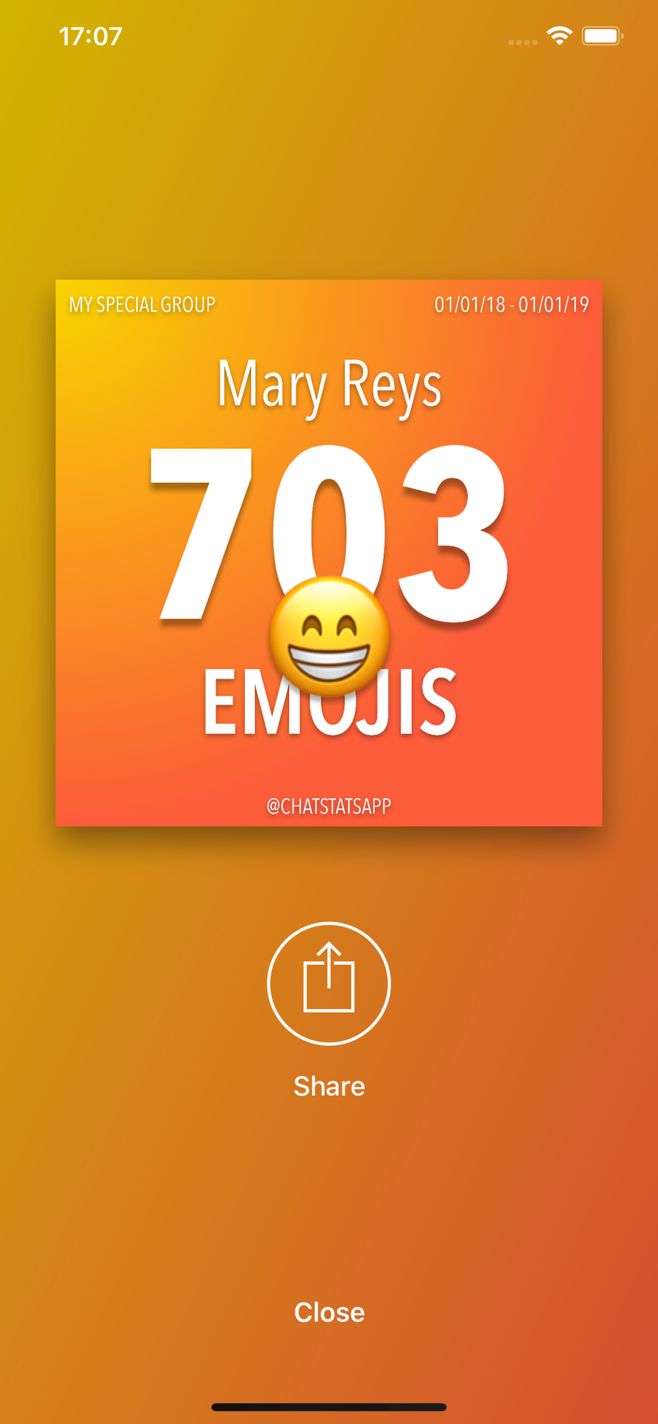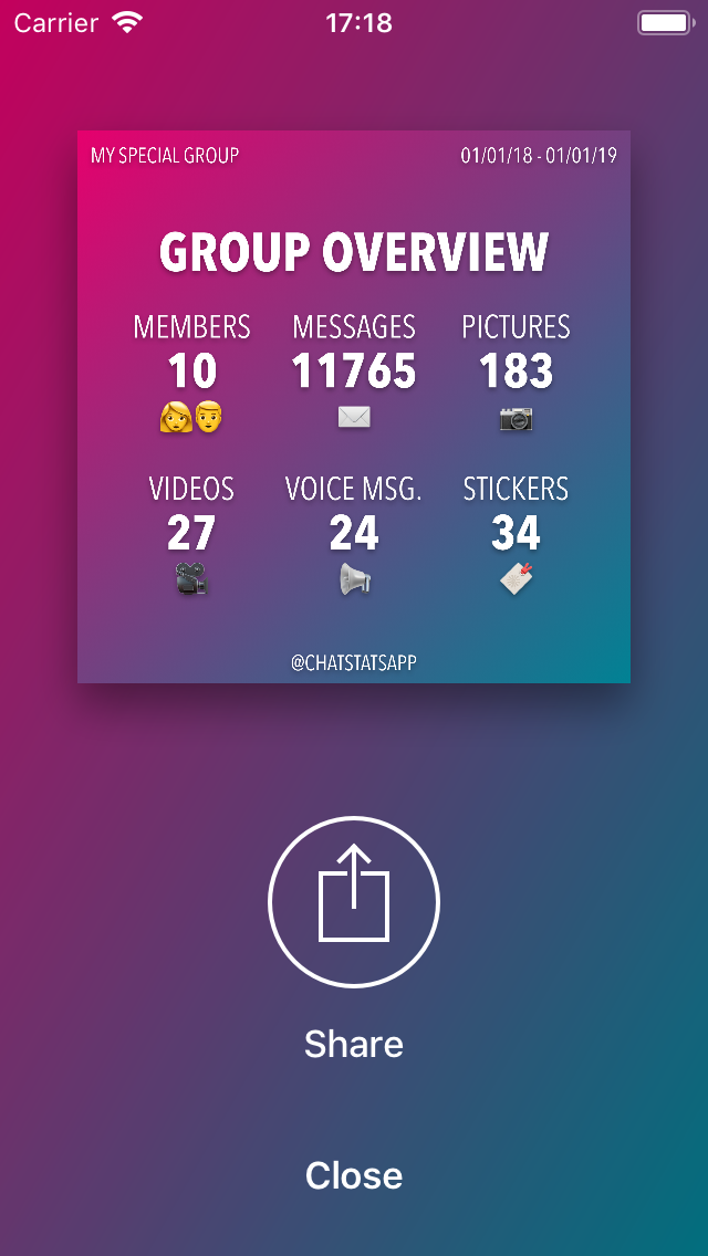ChatStats lets you import your WhatsApp™ chat histories and generates up to 24 beautifully crafted statistics to share to your groups!