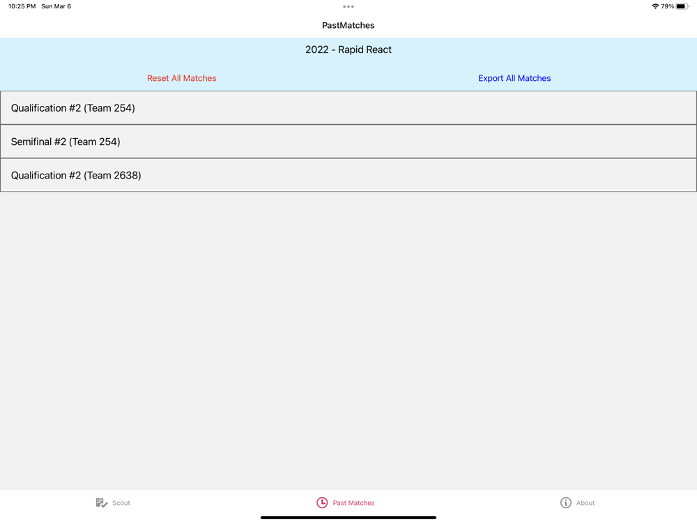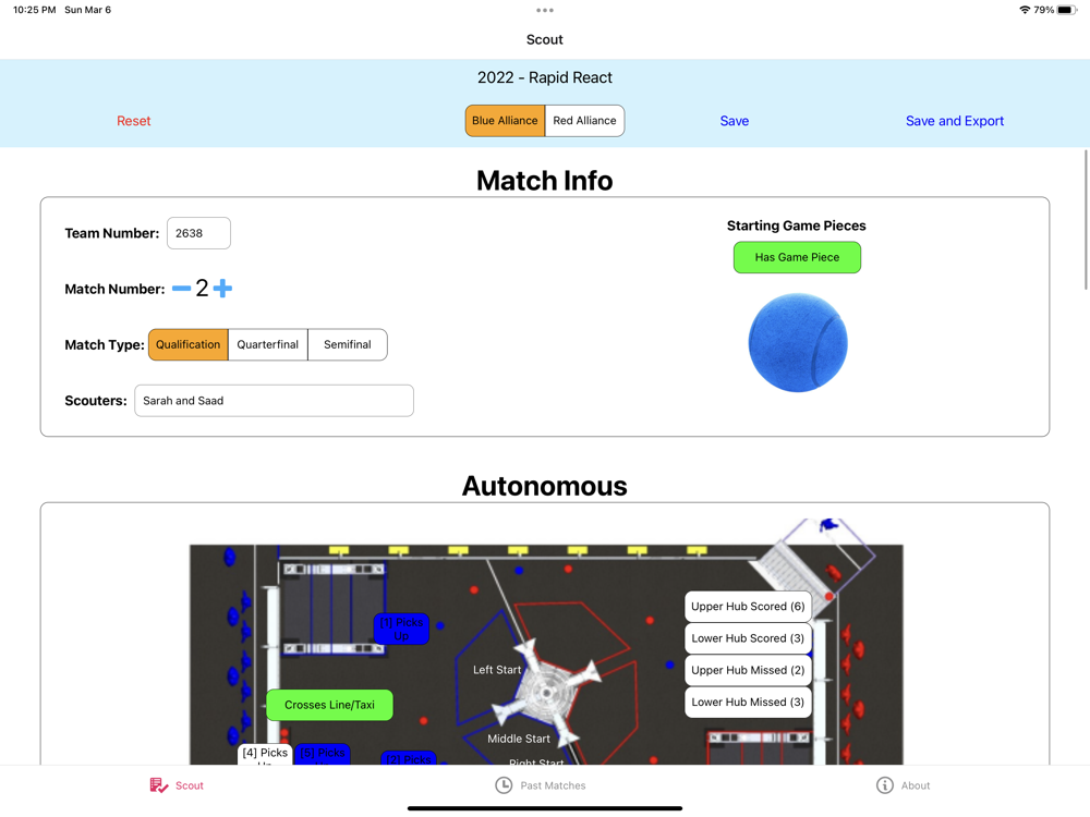 Welcome to the 2638 Scouting App! This app is specially designed for use by FRC Team 2638 to scout; however, anyone is welcome to use this app! 2638 Scout replaces the old scouting sheet and makes it easy to scout matches by simply pressing buttons on an actual game field. You can then save and export data from each match by AirDropping a CSV file to another Apple device such as a laptop, so everything works 100% offline! From there you can merge and manage the data however you like.