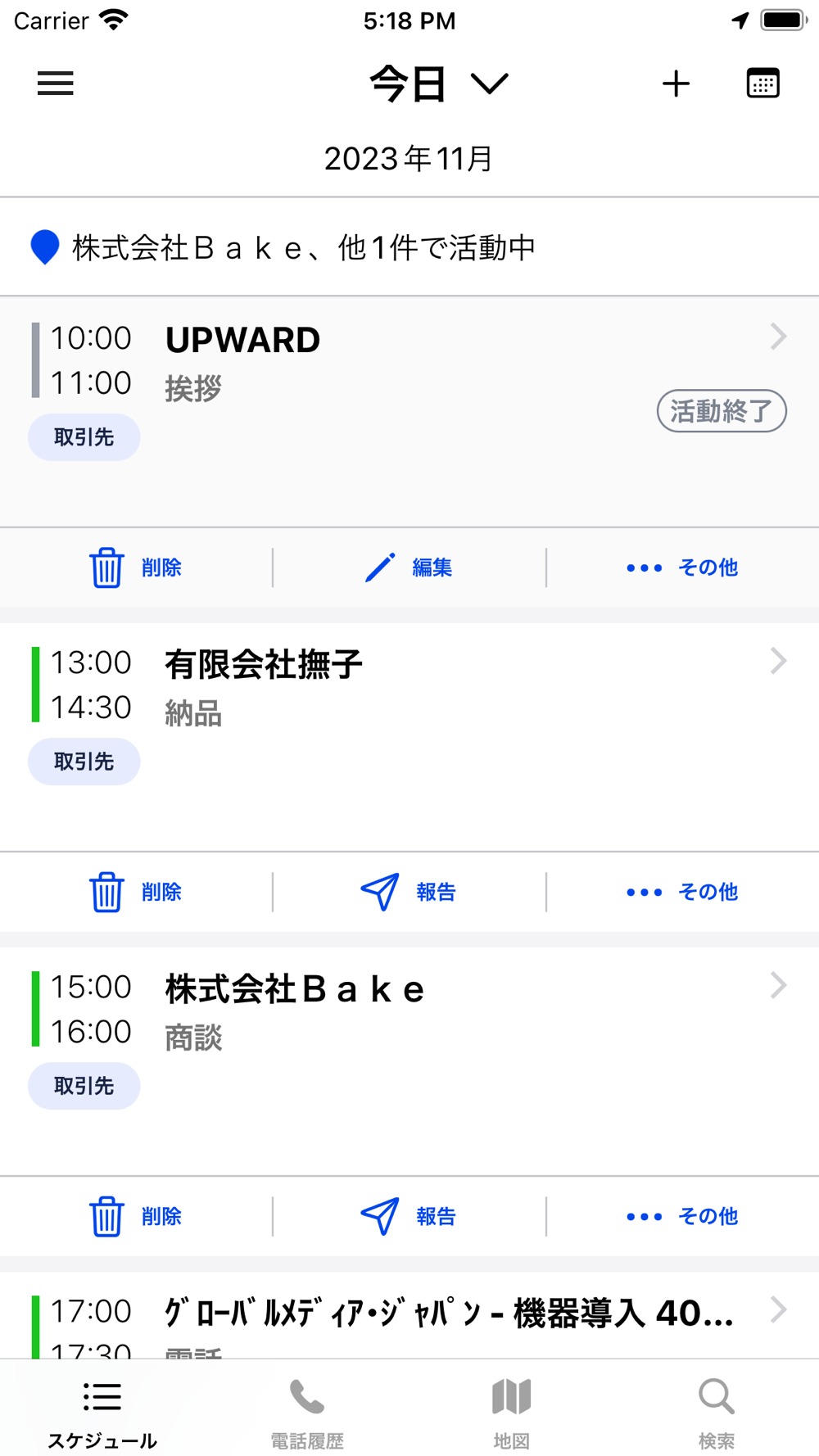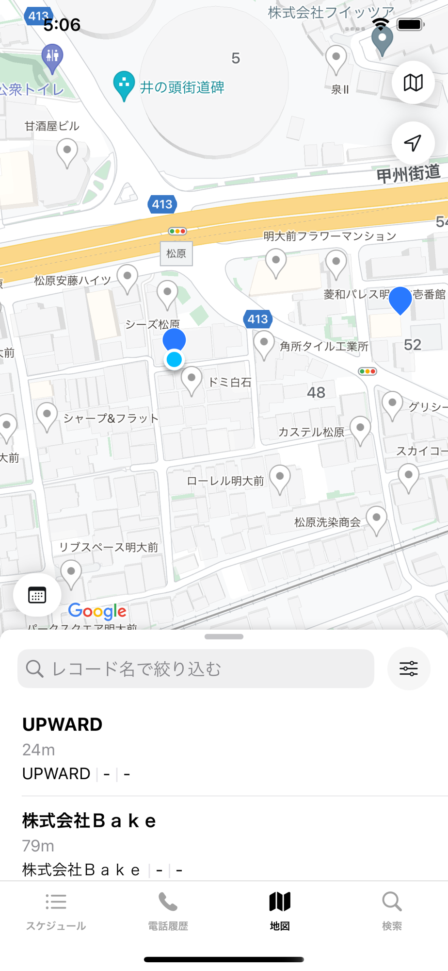 現在地の付近にある顧客を検索することができます。訪問したい顧客に対しては、電話発信、経路表示、訪問予定の追加などのアクションを数タップで行うことができます。