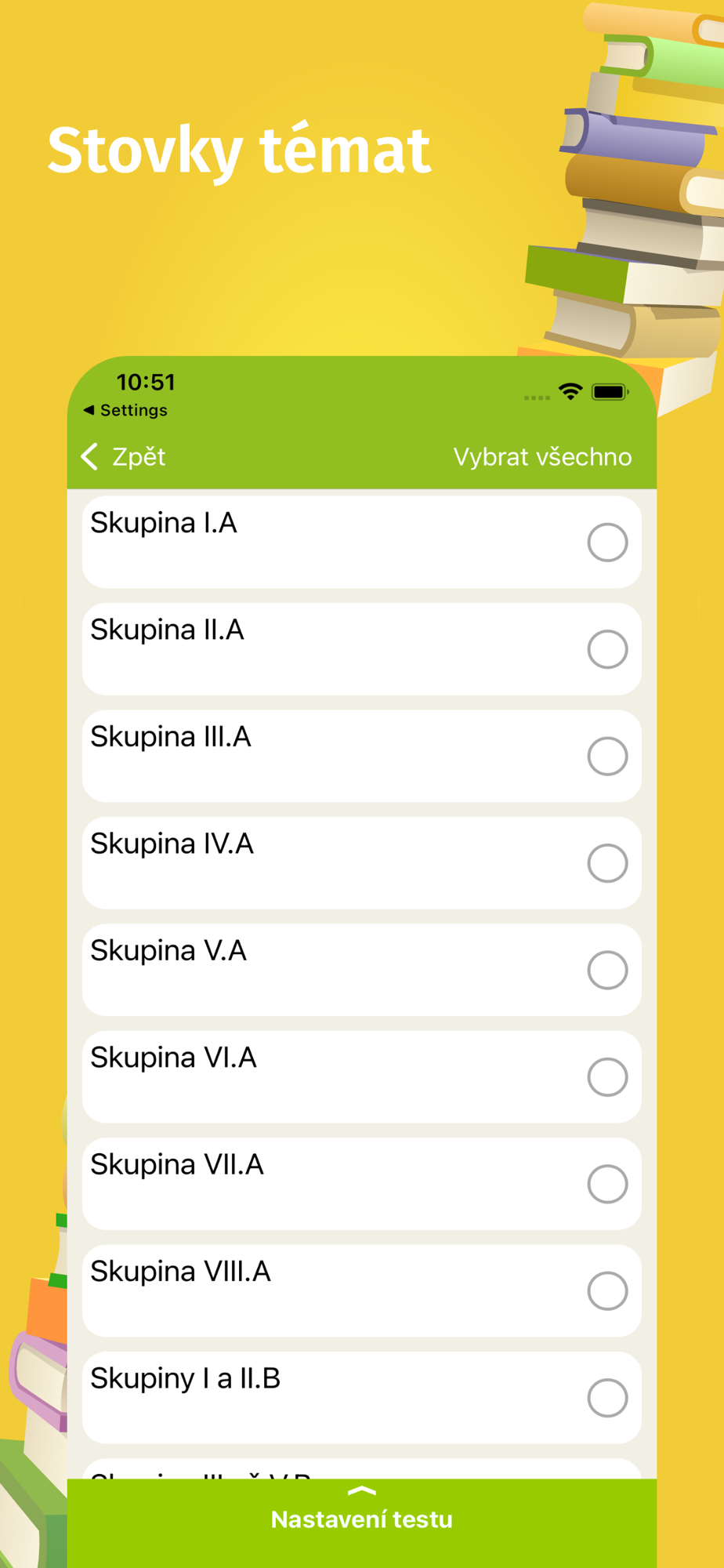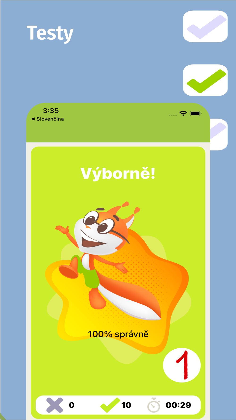 Aplikace zaznamenává statistiky a podrobné výsledky testů včetně času a správné odpovědi ke každé otázce.