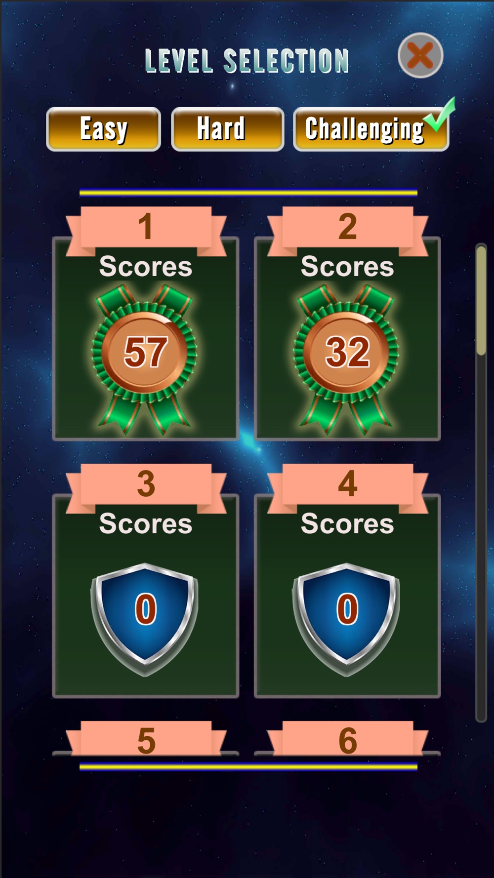 - 50 levels of difficulties in 3 groups: Easy, Hard, Challenging.