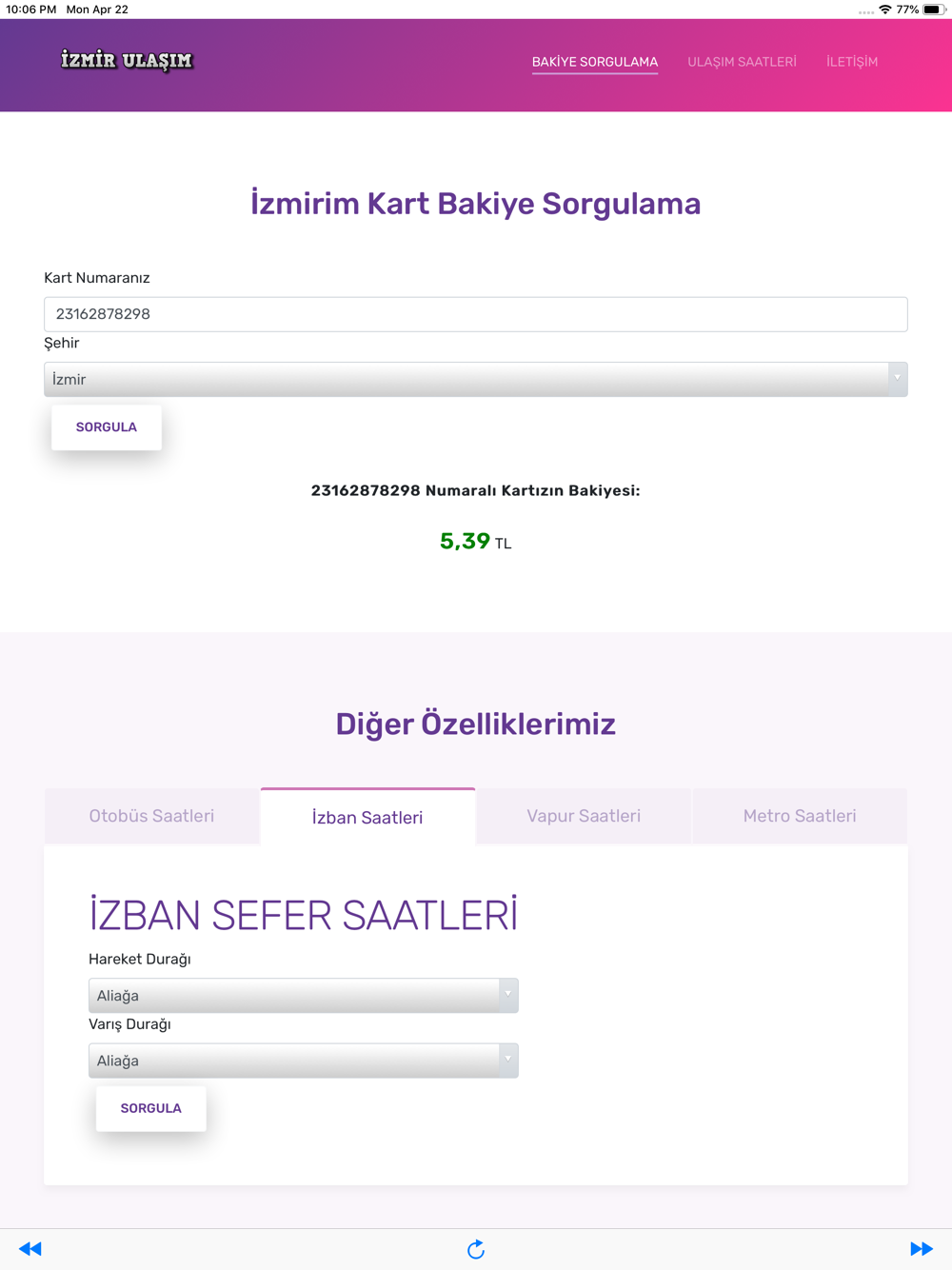 Anahtar Kelimeler : İzmir otobüs saatleri, izmir izban saatleri,izmirim kart bakiye,kentkart bakiye sorgulama,otobüsüm nerede, otobüs durak izmir, izdeniz saatleri,izmir vapur saatleri,vapur saatleri izdeniz İzmirim Kart,izban ücret hesaplama,izban ücret,İzmir, izmir büyükşehir belediyesi, izmir izum, izban ücret tarifesi, izban ,izdeniz,kentkart