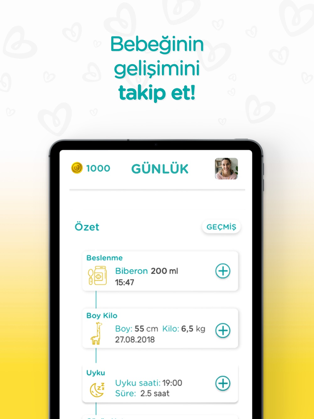 Bebeğinin beslenme alışkanlıklarını, boy & kilo gelişimini ve uyku düzenini takip edip kaydedebileceğin özelliklere sahip olan uygulama sayesinde bebek bezi indirim fırsatlarından da anında haberdar olabilirsin. Uzmanlar tarafından hamilelere, ebeveynlere ve bebeklere özel hazırlanan güncel içerikleri okuyabilir, bebek gelişimi hakkında merak ettiğin sorulara yanıt bulabilirsin.