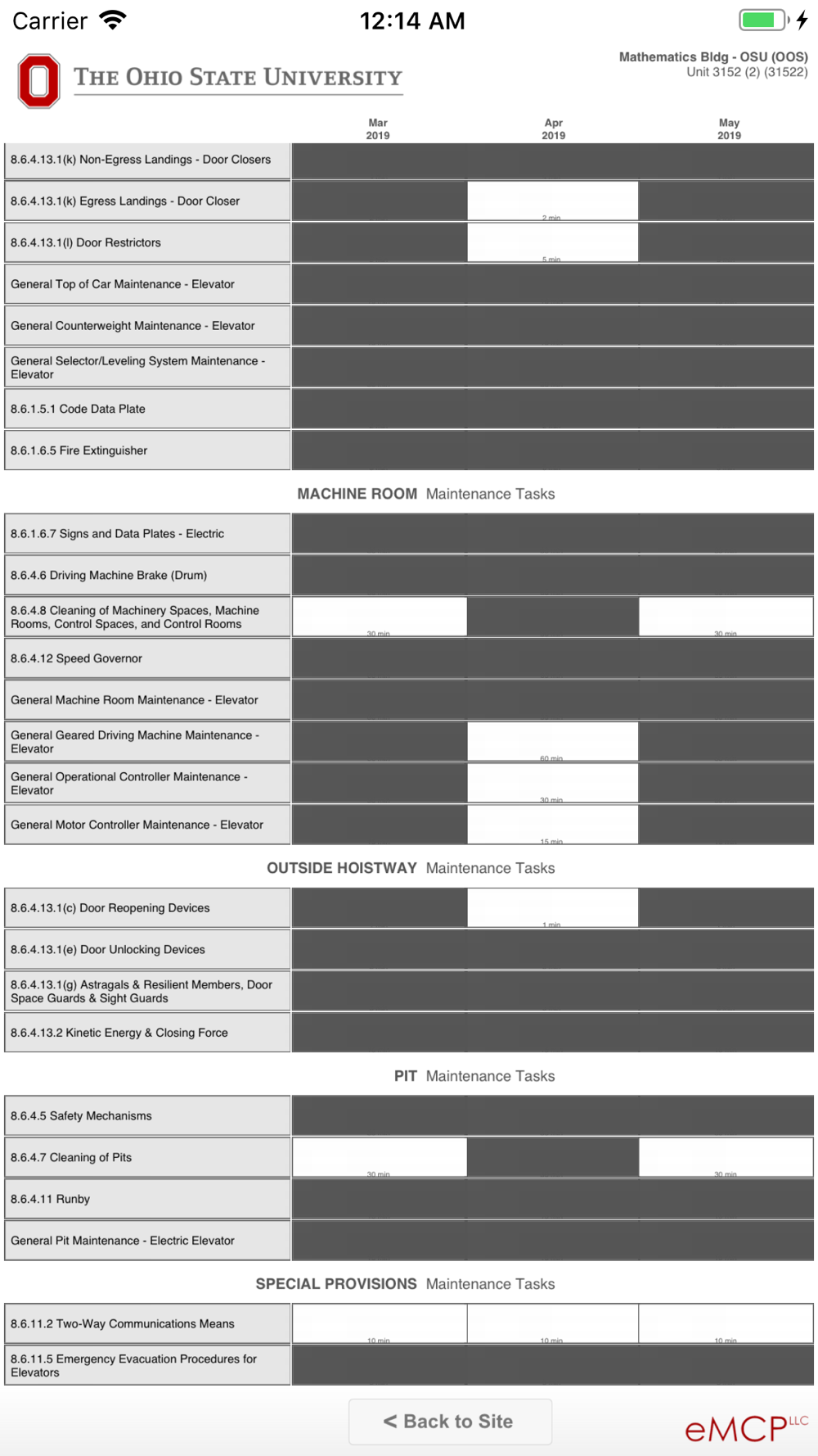 OSU eMCP 3 is the elevator maintenance control system for the elevators on campus at OSU. OSU eMCP 3 includes new features like completion percentages on the main page as well as the site pages. OSU eMCP 3 is compatible with iOS 12.