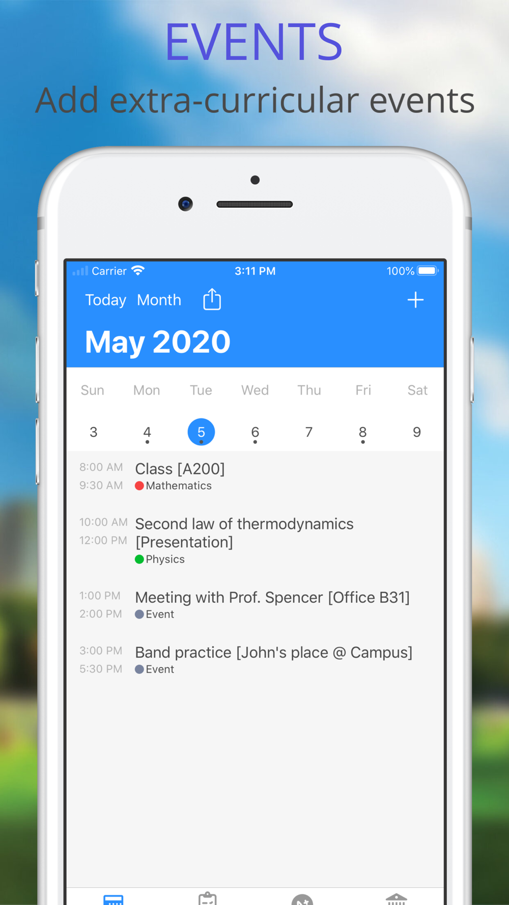 - Shows events from the device calendar to see your complete college calendar with private events