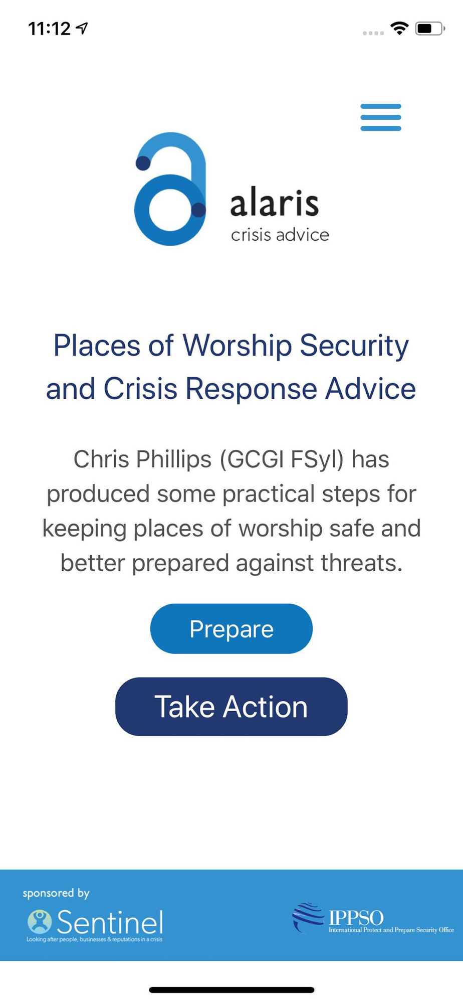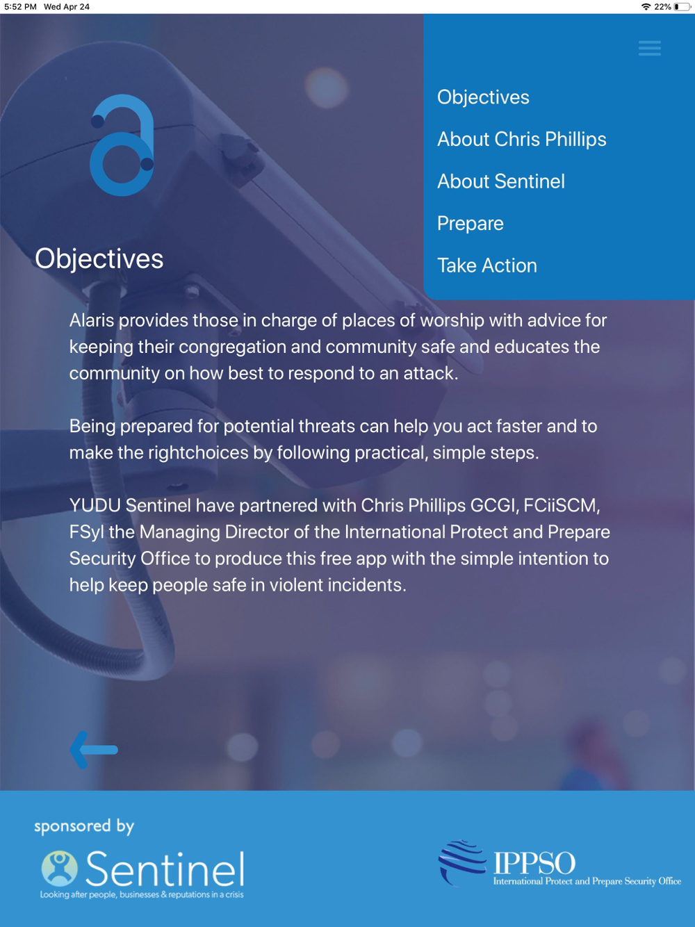 Alaris’s “Take Action” button in the app provides immediate practical steps for responding to the different threats. YUDU Sentinel have kept the design of the Alaris app simple for the benefit of people of all faiths across the world.