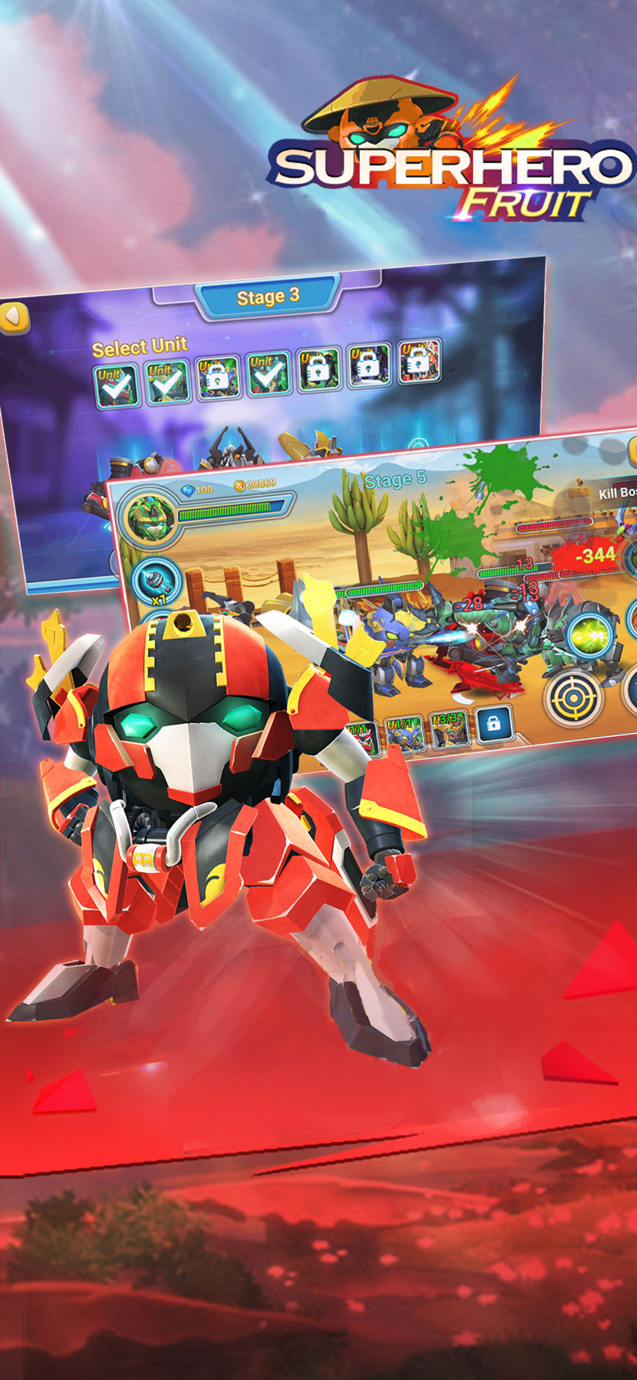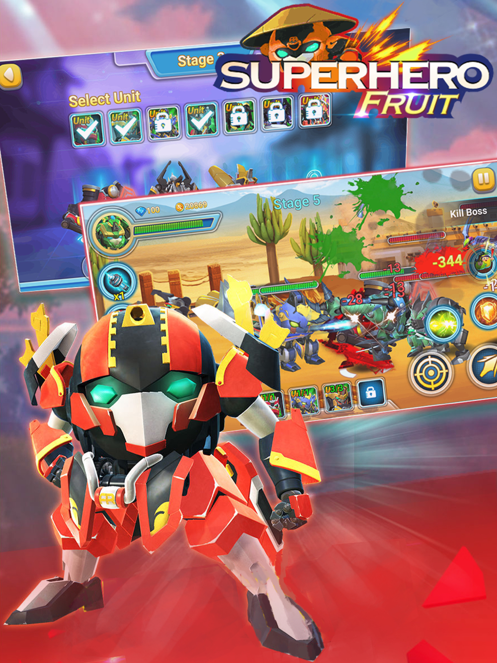 Superhero Fruit has 3 main superheroes and 7 robo assistants, each superhero or assistant possesses special skills with endless power. Choose the most powerful assistant, upgrade them and combine the legendary superhero into an invincible team to best promote the team's potential to protect their homeland.