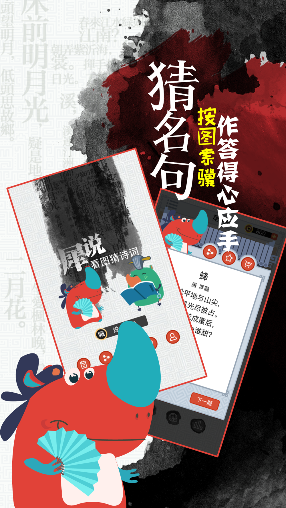 这是一款寓教于乐、独一无二的看国画猜诗词名句的游戏。两大特色,秒杀群雄:画面全部为水墨手绘,古风古韵,清新雅致,为玩家展现画中有诗的优美风物;内容精选家喻户晓、耳熟能详的历代古诗词曲名句,传神地展现诗中有画的绝美意境!