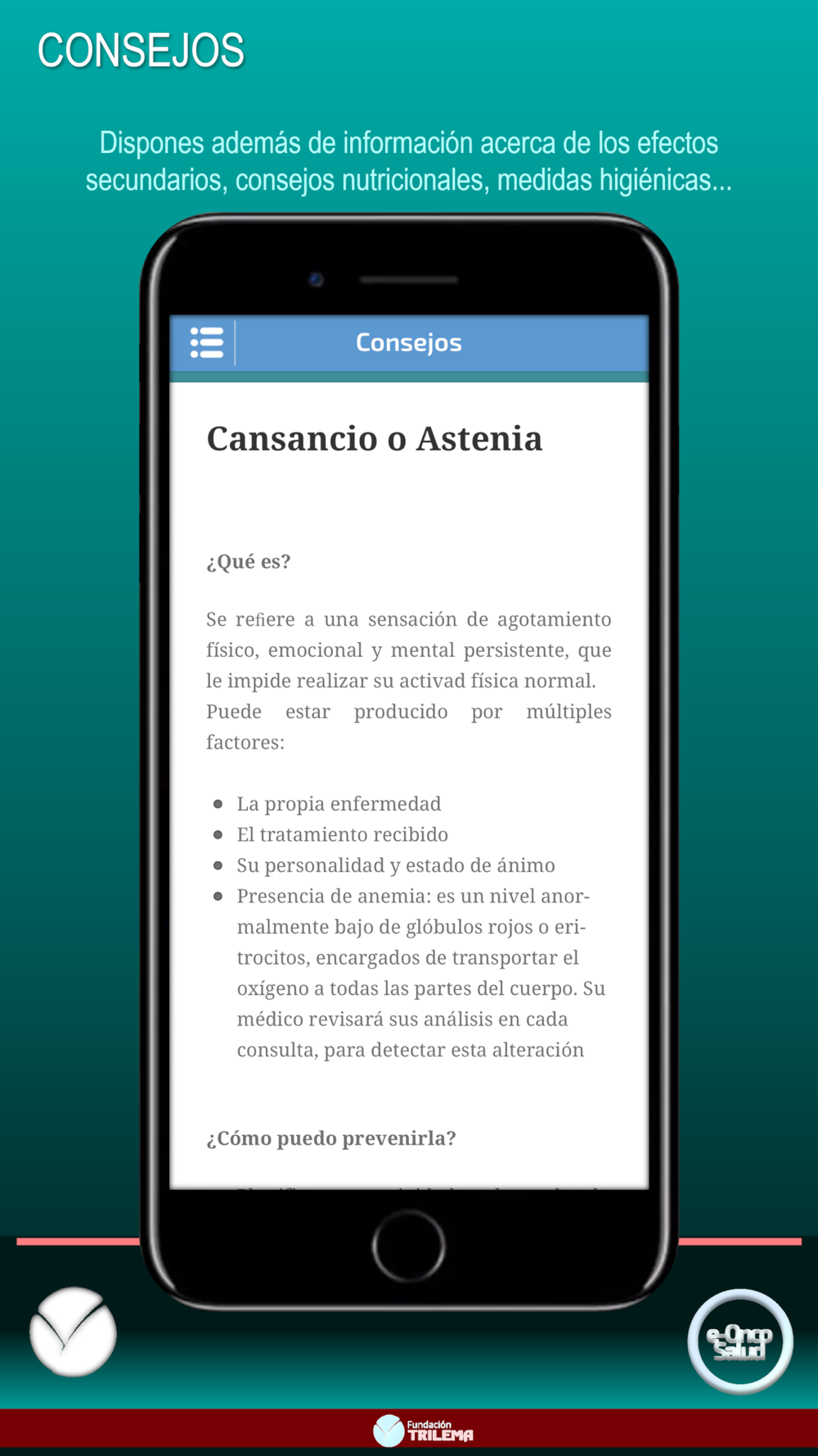 • TRATAMIENTO: e-Onco Salud es una herramienta de ayuda para gestionar tu tratamiento farmacológico, permitiéndote planificar y validar las tomas de los fármacos en cada momento. Desde la aplicación podrás también añadir otros fármacos y tratamientos. Contiene información, fotografías, prospectos y recomendaciones sobre el tratamiento farmacológico, así como precauciones a tomar e información sobre posibles interacciones.