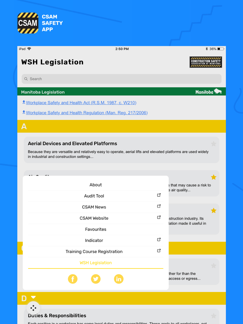 In Manitoba, the Workplace Safety and Health Act and the Workplace Safety and Health Regulation contain legal requirements that must be met by all Manitoba workplaces. Many sections of the legislation have associated guidelines and publications to help workplaces meet these requirements.