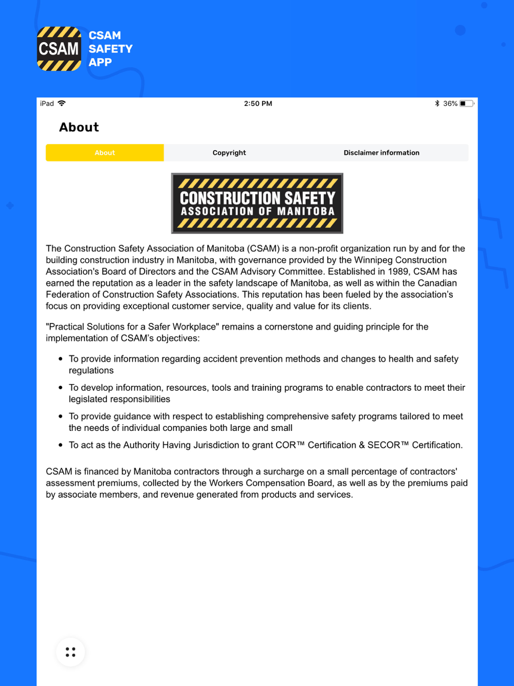 These documents have been provided to help keep our workforce healthy and safe. We hope you find them useful. Please feel free to share them for educational purposes only – they may not be redistributed for profit. They may not be modified or reproduced without the permission of the Construction Safety Association of Manitoba. Please contact CSAM at
