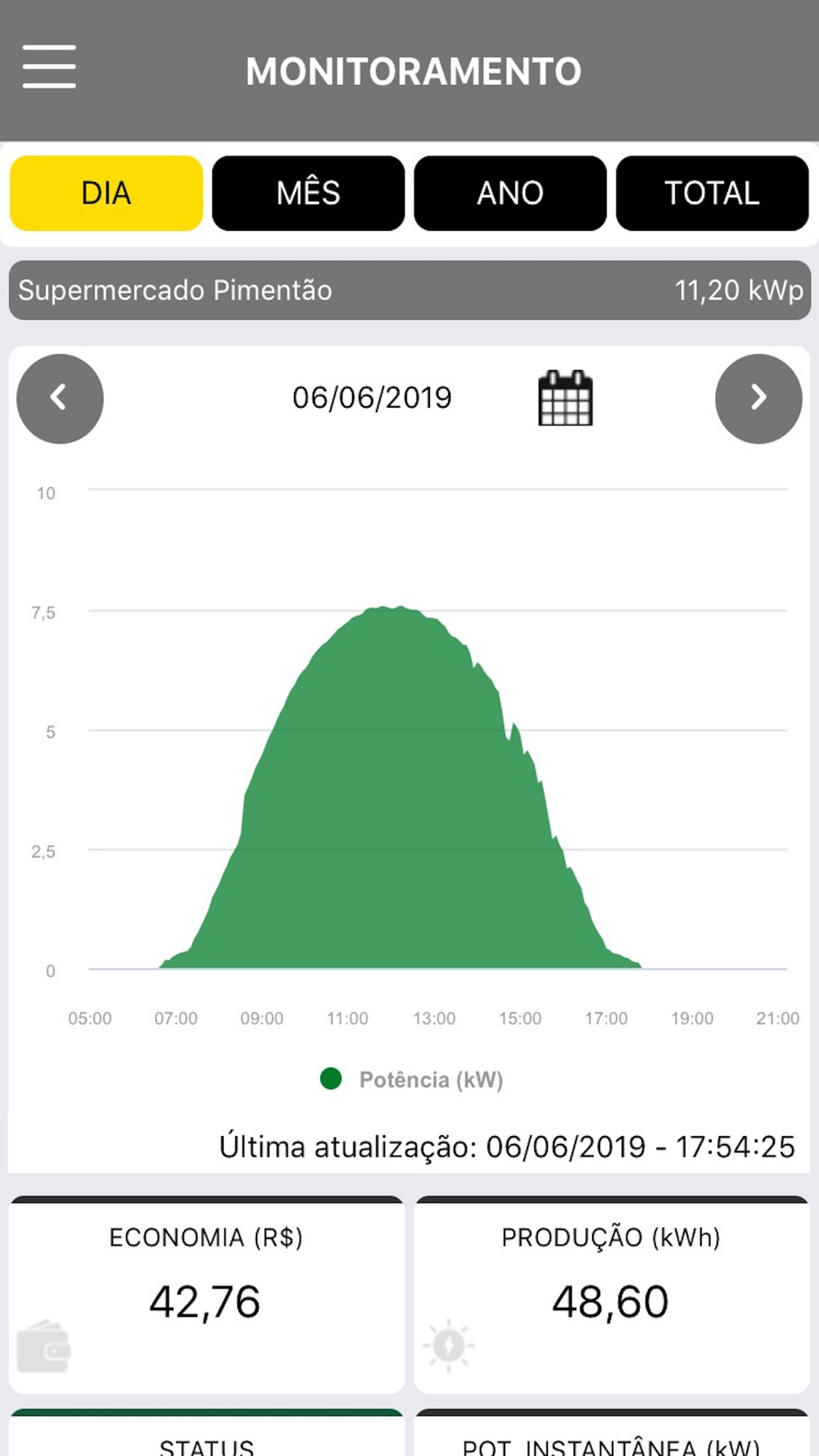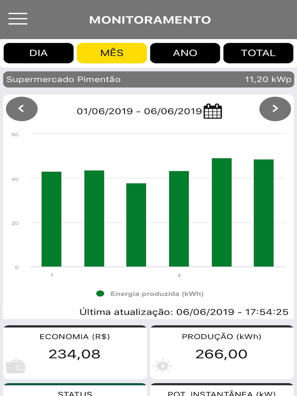 É possível visualizar a todo momento a produção solar, consumo de energia e as economias alcançadas.