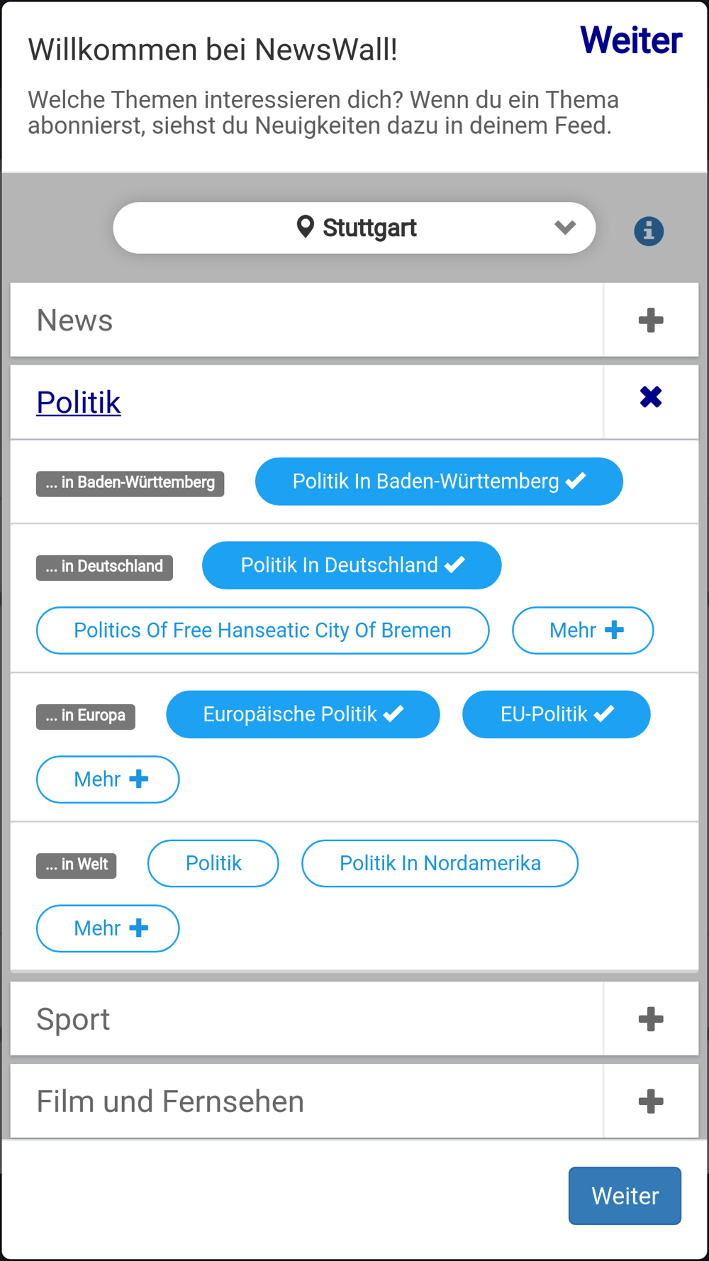 You can subscribe to topics from the areas of general news, politics, business & technology, brands & products, film & television or sports and also set how much you want to see.