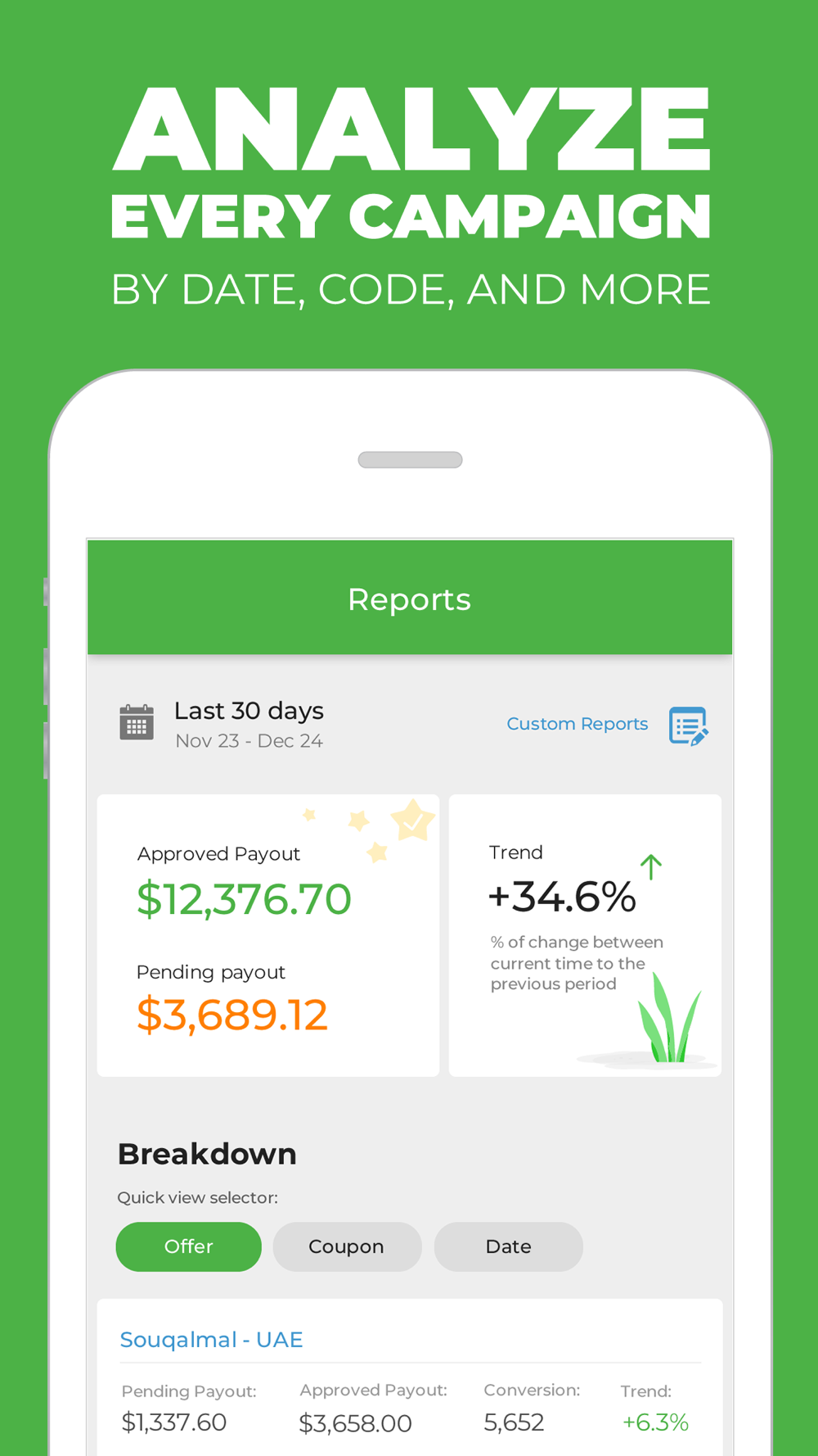 ArabClicks’ App makes it easy to keep track of your affiliate campaigns, using just your mobile. Easily monitor your running promotions, see money-making coupons & discounts and act immediately to earn from the trend - wherever you are!