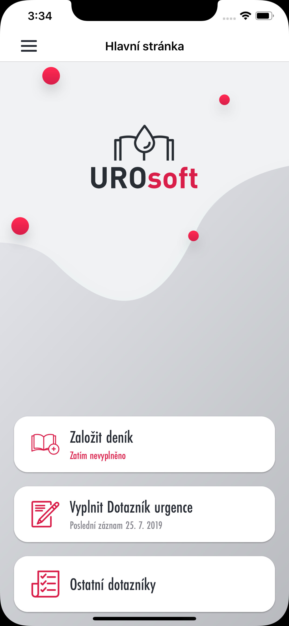 Po krátké registraci se můžete přihlásit do aplikace. Na hlavní stránce je Vám nabídnuta možnost založit mikční deník nebo vyplnit jeden z dostupných dotazníků. Hlavním testem je právě Mikční deník, který doporučujeme vést po dobu alespoň dvou dnů. V rámci deníku zaznamenáváte veškeré močení a příjmy tekutin.