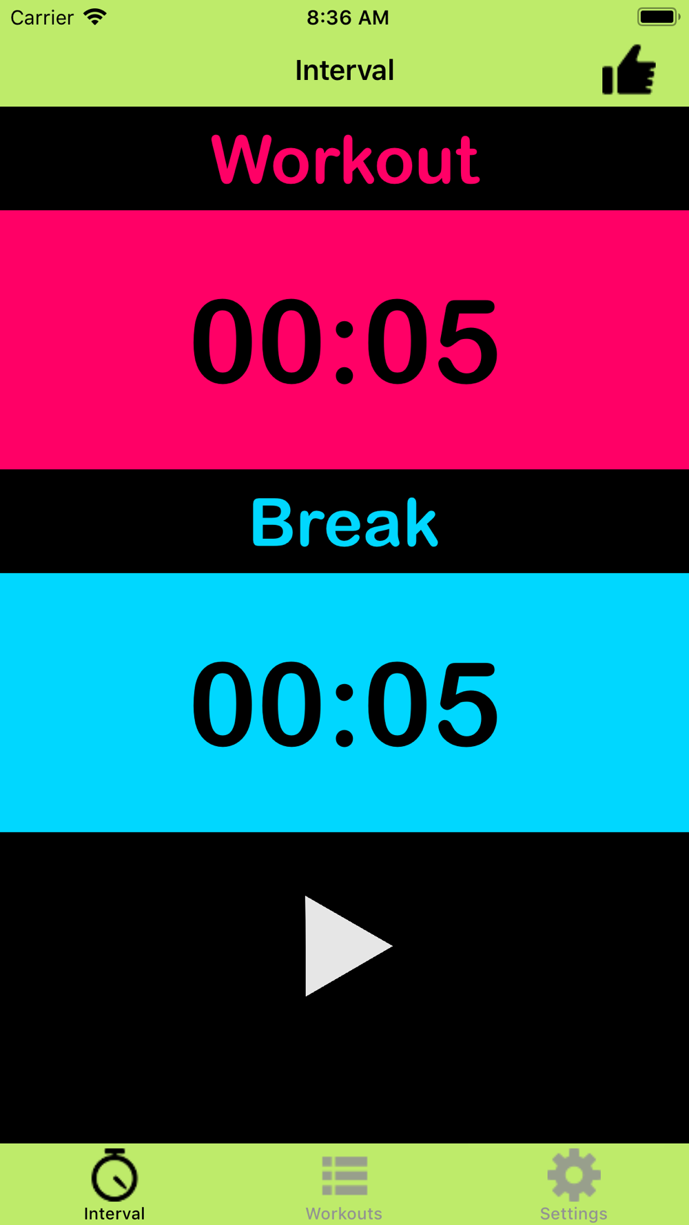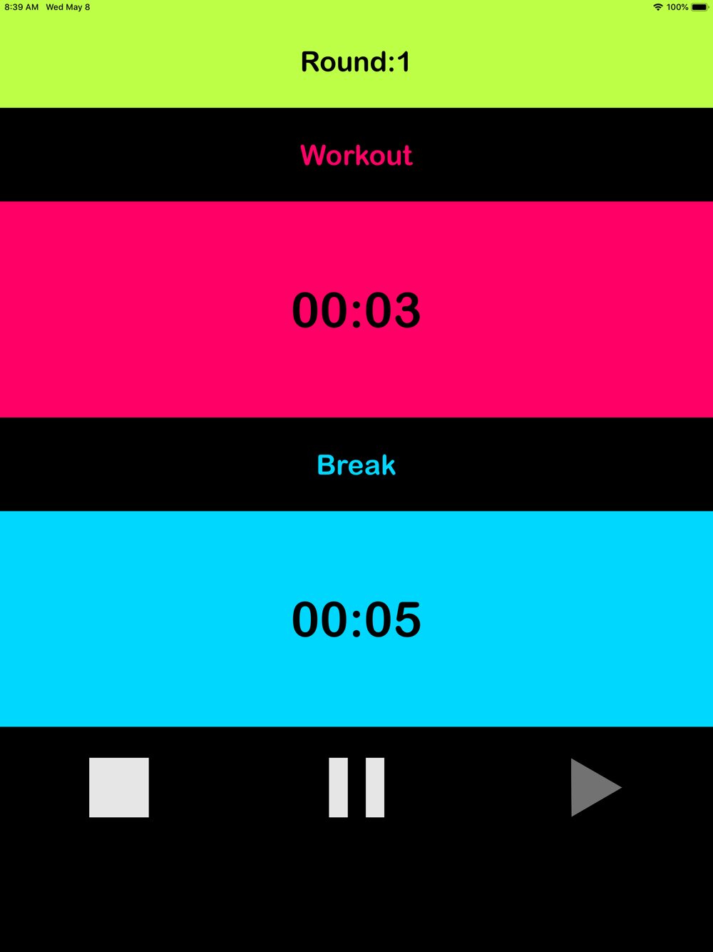 You can start the timer just by setting the workout time and break time. There is no complicated setting. No user registration is required, and you can use it immediately after installation.