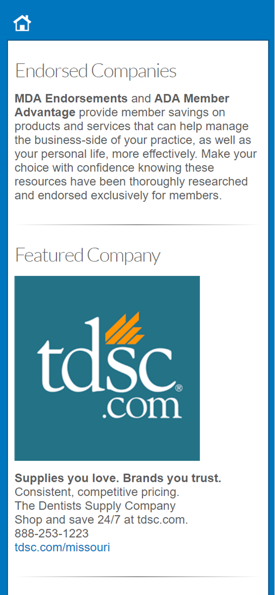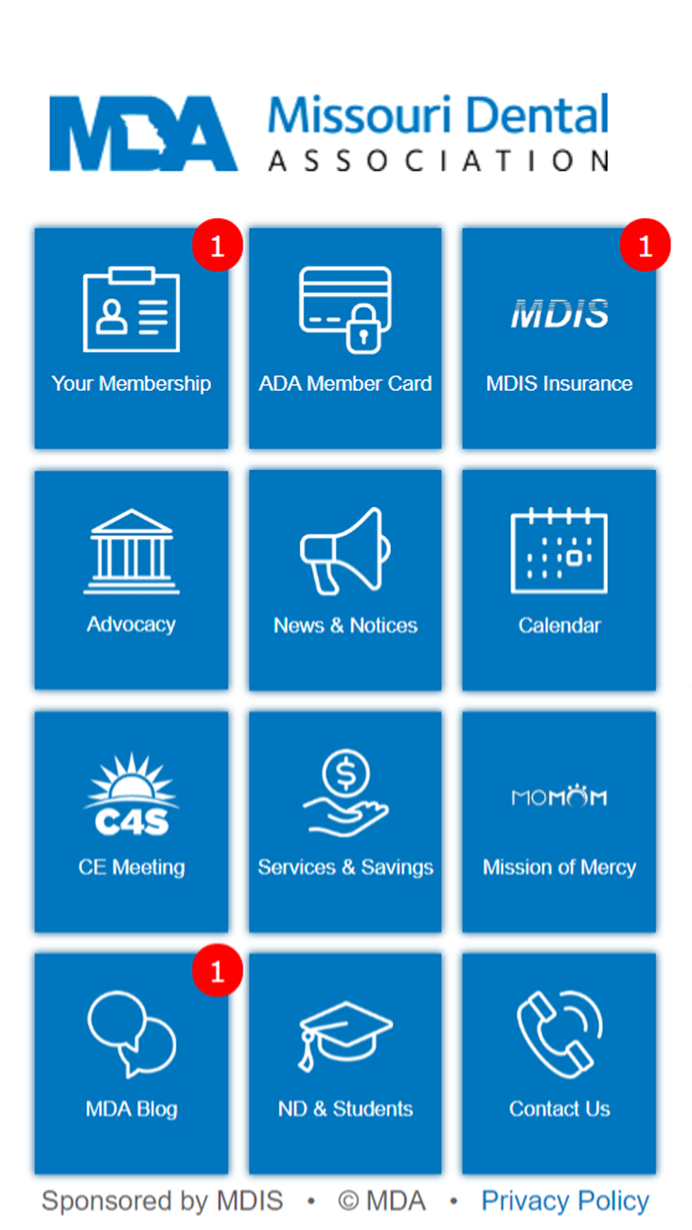 Missouri Dental Association (MDA) members can access ADA number, stay current with MDA news, find the most up-to-date calendar and events, get links to CE, savings and more.