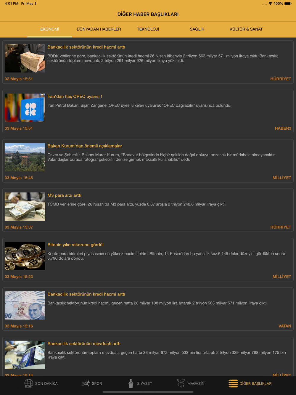 - Spor, Magazin, Ekonomi, Son Dakika, Kültür Sanat, Sağlık başlıklı haber kategorilerini barındırır.
