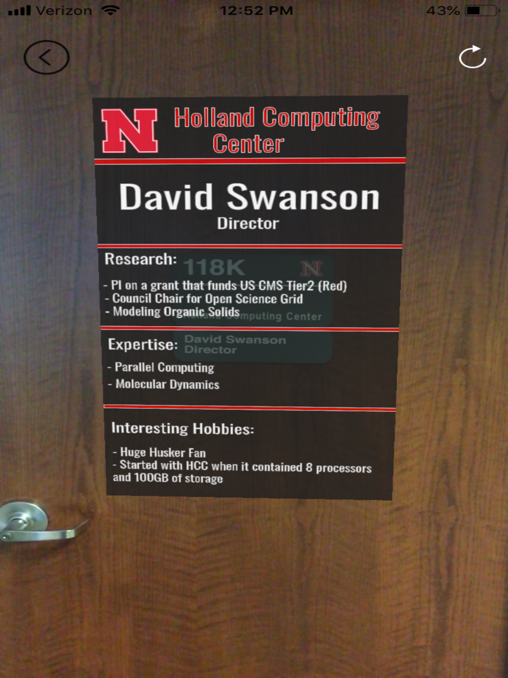 HCC2Go offers a self-guided, interactive tour of the Holland Computing Center (HCC) offices on the University of Nebraska-Lincoln campus. The augmented reality interface provides information about HCC's staff scientists and offers an interactive scavenger hunt with videos that explain what the University's High Performance Computing Core is and what type of notable research is being done at HCC.