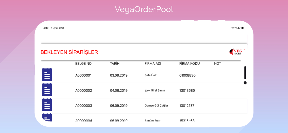 VegaOrderPool sayesinde gelen siparişlerinizi görüntüleyebilir , detaylarına bakabilir ve envanter durumunuzu kontrol edebilirsiniz. Sevk havuzuna bakabilir sek emri fişi oluşturabilirsiniz.
