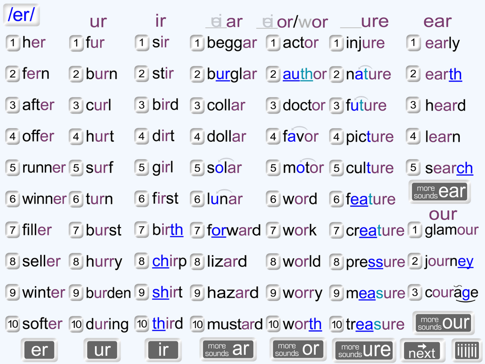 Finally! Anyone can understand how to read English vowels! We have 20 vowel sounds but only 6 vowel letters, so we reuse letters or use letter teams to represent some sounds. There are also multiple ways to represent most vowel sounds. Whether you are a native English speaker or an English language learner, it is very difficult to figure it all out, and much of it isn’t taught in schools. It’s no wonder so many English-speaking children never learn to read well. We’ve organized the 53 vowel spellings in a way that makes it clear! We show you all of the options and provide you information to help you choose the correct sound when you read. We clearly show you which letters work together as a team and which letters provide information about other letters nearby. Practice reading words organized by sound or by spelling. Touch the screen to hear confusing letters and to check if you read a word correctly.