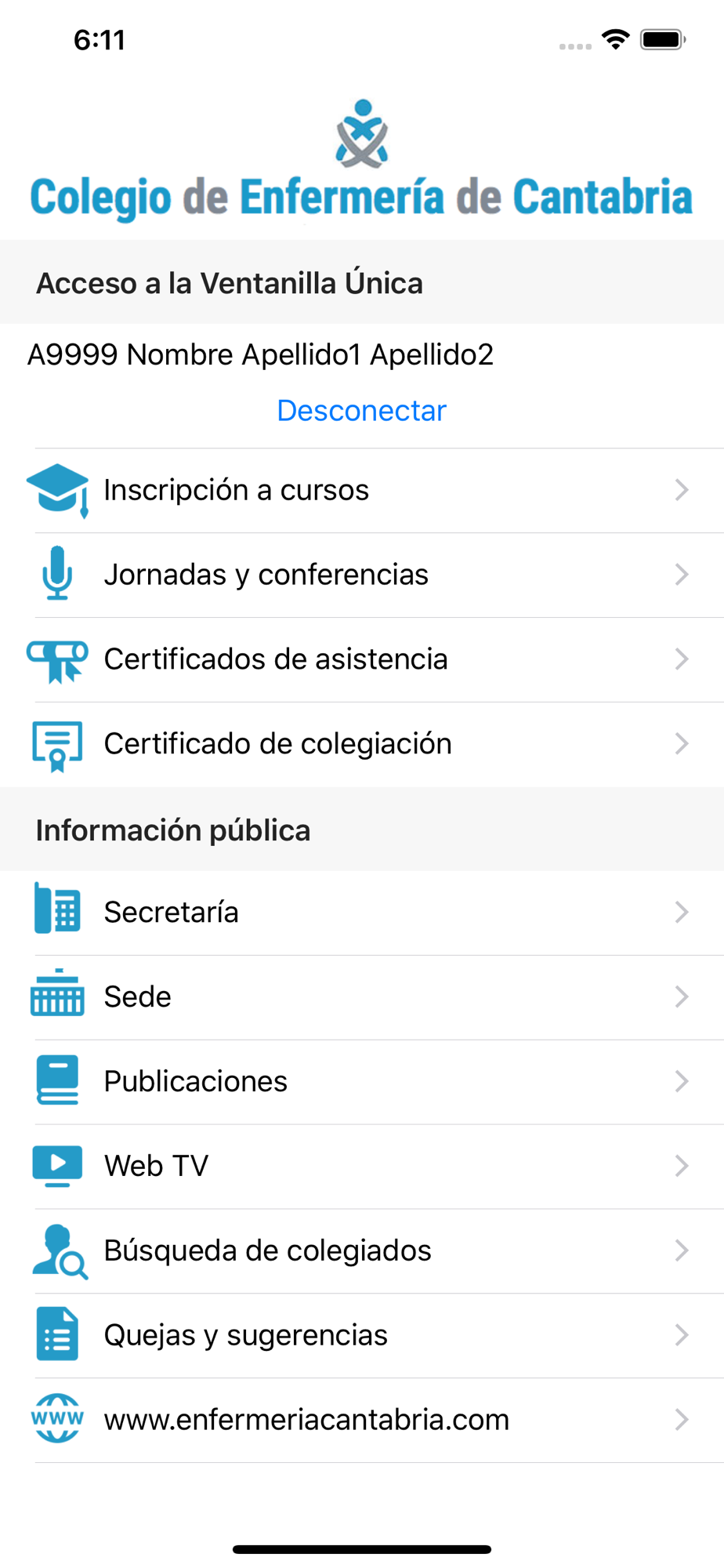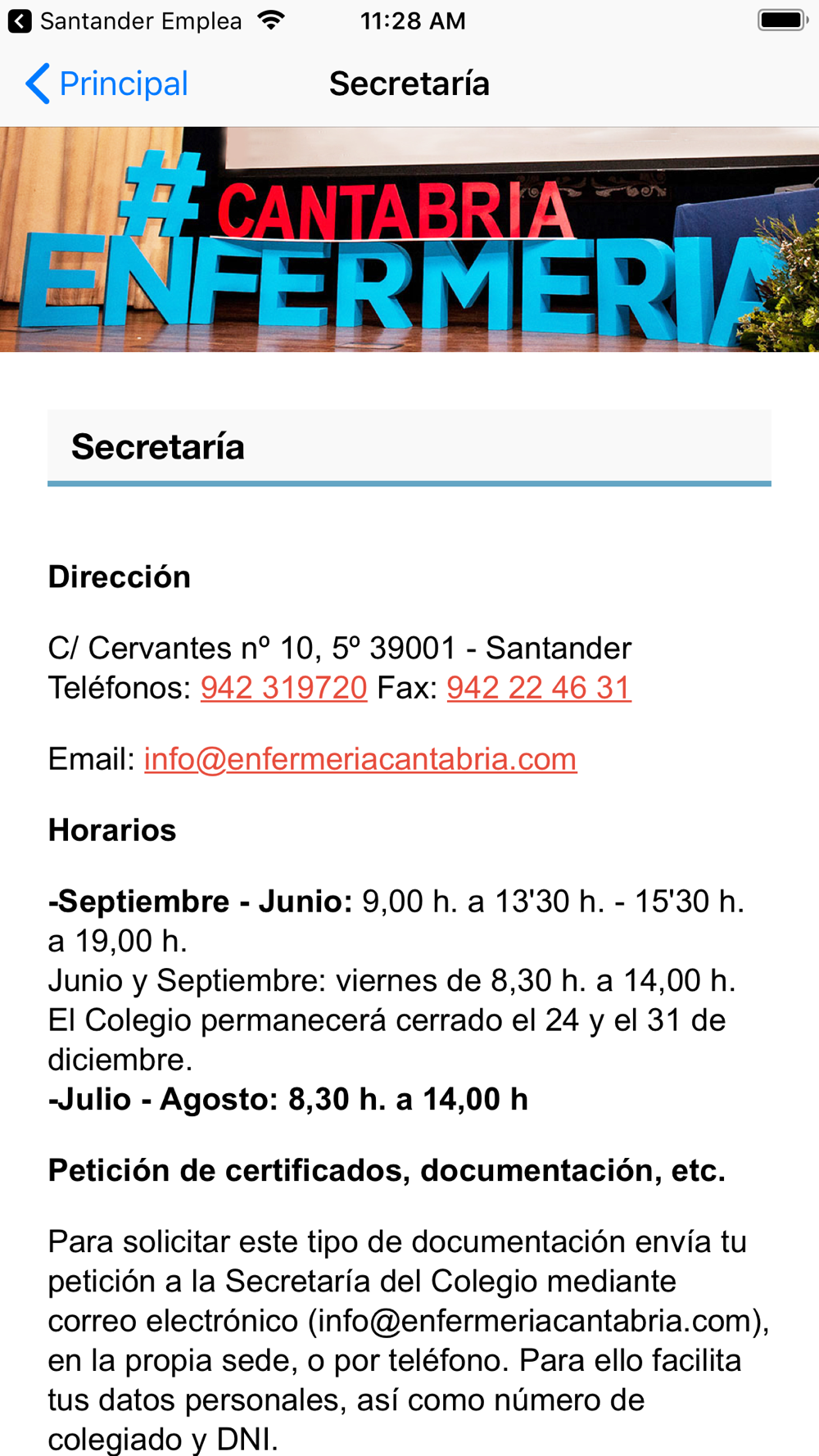 La app oficial del Colegio de Enfermería de Cantabria permite acceder a información acerca de la actividad del Colegio, tanto para sus colegiados como para el público en general. A través de la app oficial del Colegio se puede acceder a información general del Colegio, las Publicaciones del Colegio, los vídeos de su Web TV, formularios de quejas y sugerencias, y búsqueda de colegiados. Adicionalmente, los colegiados podrán acceder a su área privada (ventanilla única) a través de la cual podrán inscribirse en cursos y jornadas, descargar certificados de cursos y de colegiación, entre otras funciones.