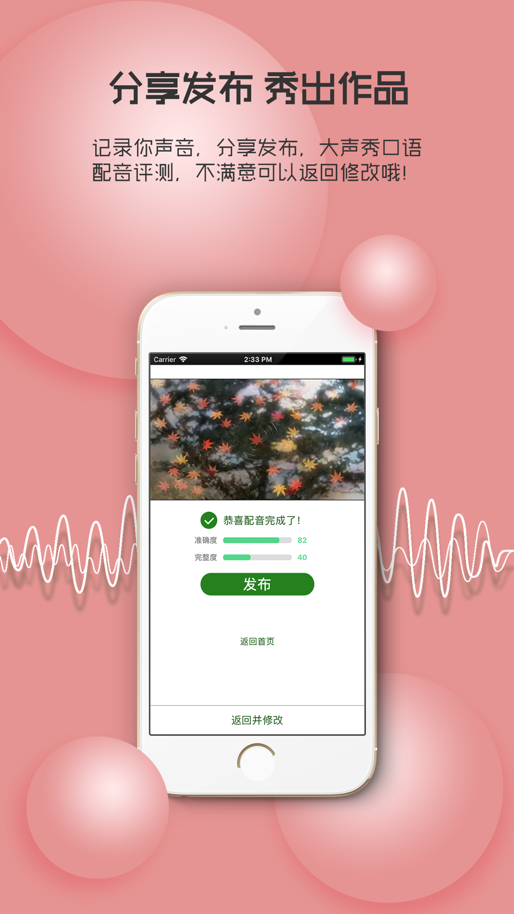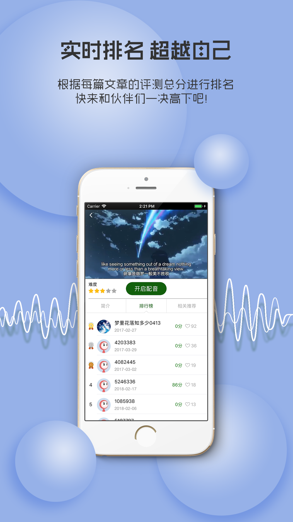 1、【玩配音秀口语】听腻了影视剧里的台词,多想加入自己的声音!海量热门经典美剧,电影大片等你来配音,秀口语,做自己的主角!不背单词、不记语法,摆脱一切枯燥无味的英语学习方法,将你的英语提升到母语水平!