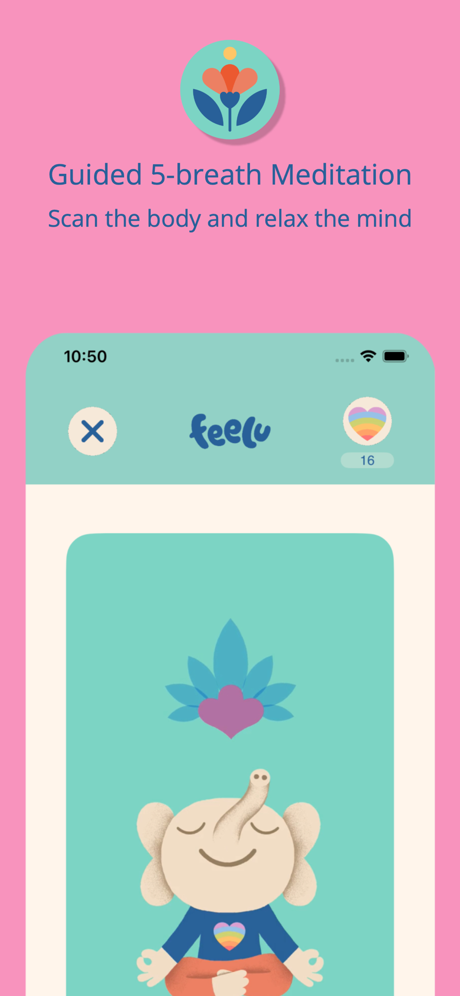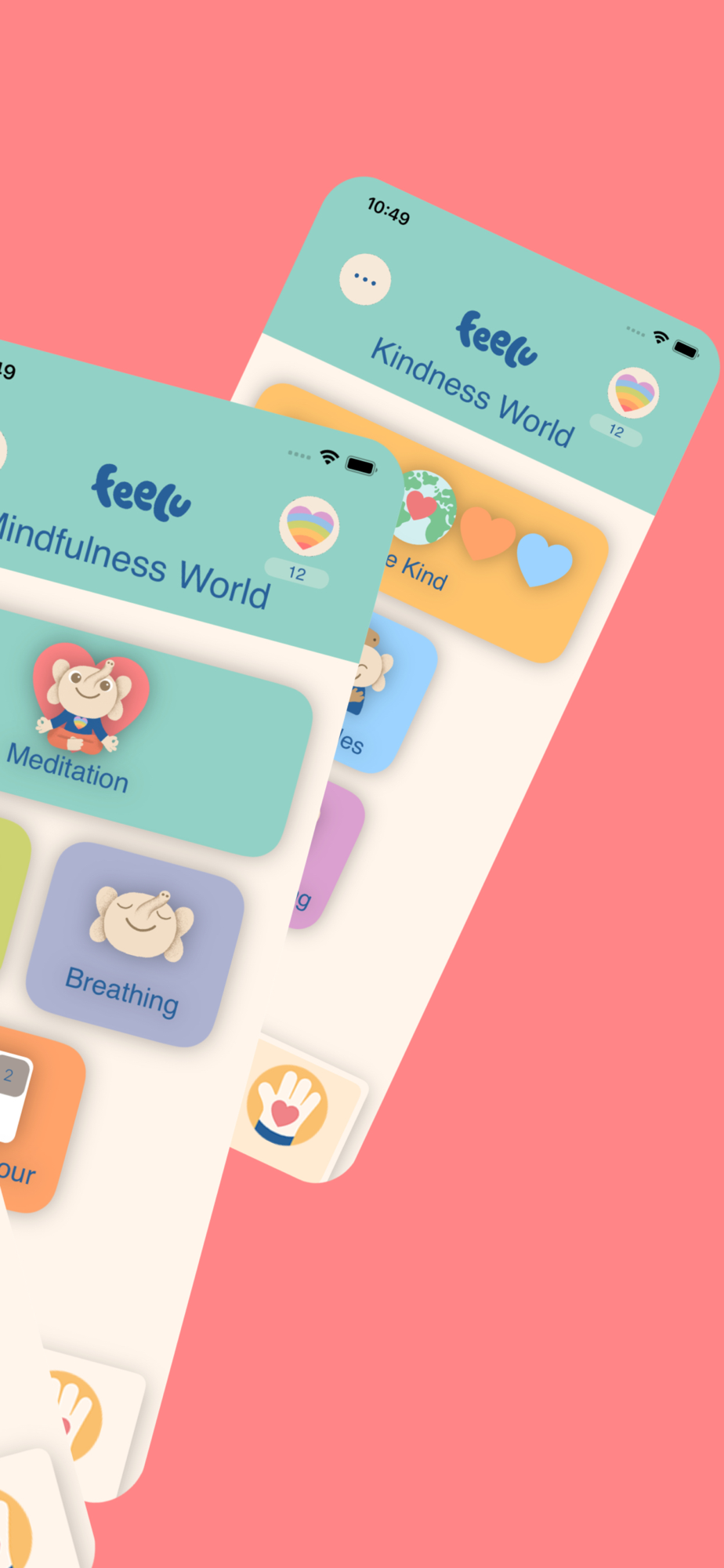 Feelu has three worlds: Feelings, Mindfulness, and Kindness.