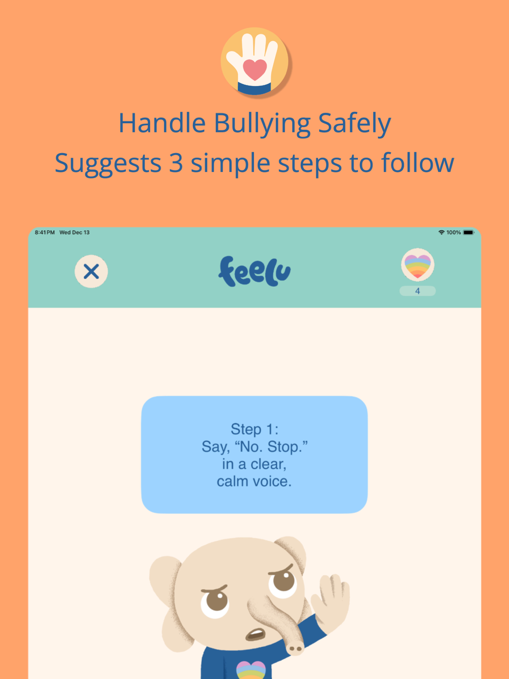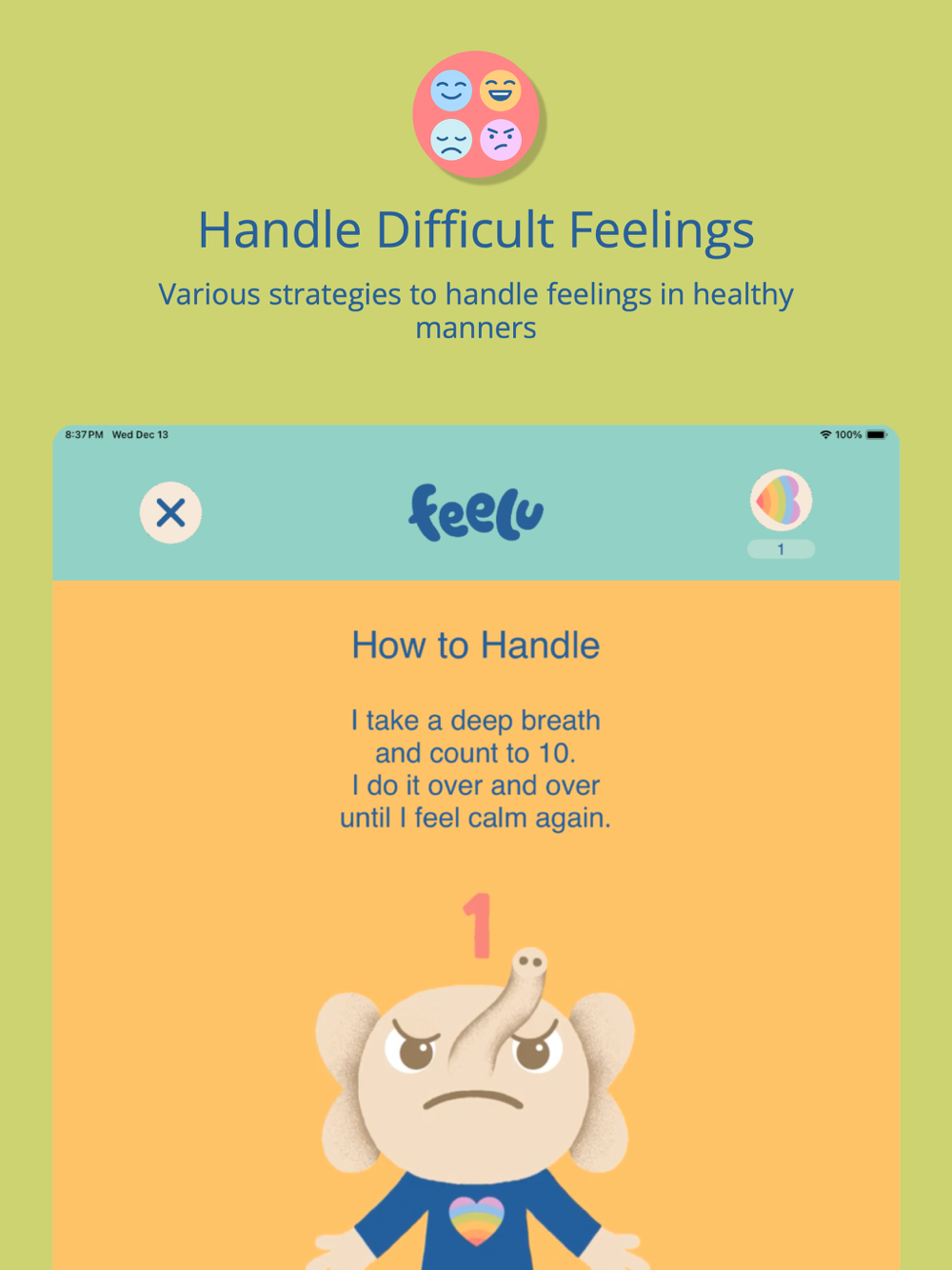 Feelu helps children to learn their emotions through videos, games, and daily journal and provides different strategies to regulate and control their emotions in a healthy manner. It promotes empathy, compassion, and accepting others. Feelu also focuses on gratitude and mindfulness.