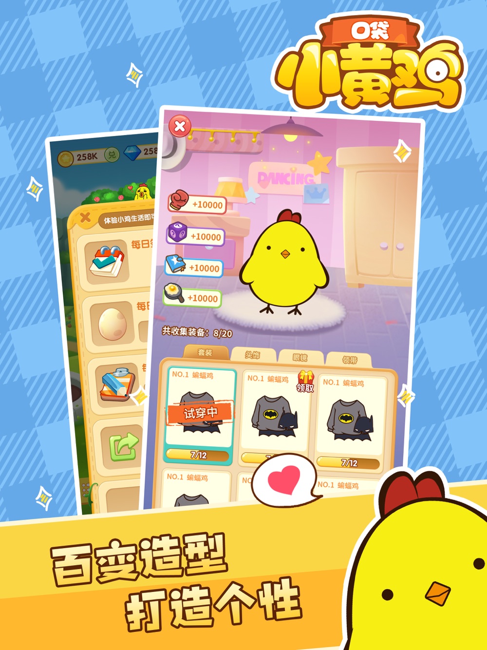 口袋小黄鸡是一款新颖而怀旧的宠物养成类休闲社交游戏。在游戏里你会找到童年时玩电子鸡“Tamagotchi”的逗逼乐趣,不过时代不同喇,在高端的开发技术协助下,电子鸡已经由黑白马赛克进化到的4K高清肉感鸡喇(纯洁的微笑)!