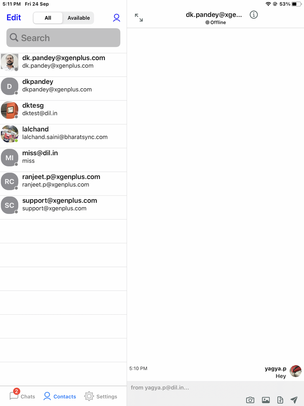 Xgenplus Chat is Instant Messaging Platform powered with XgenPlus Enterprise Email Platform. This allows Organisations to secure access to data, No access to unauthorized users and no one can add you or send you messages without your permission. This is like your own Company Encrypted Instant messenger with Presence, Status, Delivery, Read report, File Exchange and simultaneously works on web and mobile.